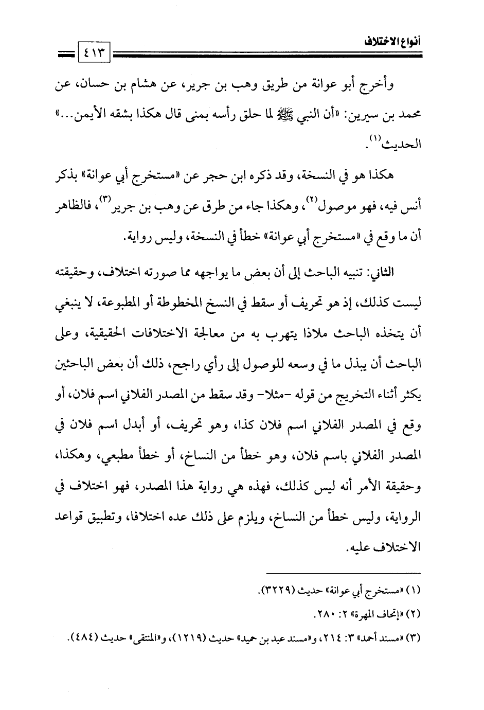 الثاني: تنبيه الباحث إلى أن بعض ما يواجهه مما صورته اختلاف، وحقيقته ليست كذلك، إذ هو تحريف أو سقط في النسخ المخطوطة أو المطبوعة، لا ينبغي أن يتخذه الباحث ملاذا يتهرب به من معالجة الاختلافات الحقيقية، وعلى الباحث أن يبذل ما في وسعه للوصول إلى رأي راجح، ذلك أن بعض الباحثين يكثر أثناء التخريج من قوله -مثلا- وقد سقط من المصدر الفلاني اسم فلان، أو وقع في المصدر الفلاني اسم فلان كذا، وهو تحريف، أو أبدل اسم فلان في المصدر الفلاني باسم فلان، وهو خطأ من النساخ، أو خطأ مطبعي، وهكذا، وحقيقة الأمر أنه ليس كذلك، فهذه هي رواية هذا المصدر، فهو اختلاف في الرواية، وليس خطأ من النساخ، ويلزم على ذلك عده اختلافا، وتطبيق قواعد الاختلاف عليه.