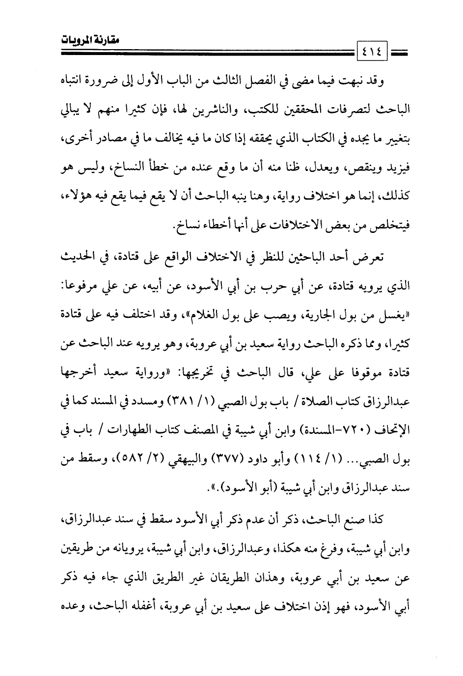 تعرض أحد الباحثين للنظر في الاختلاف الواقع على قتادة، في الحديث الذي يرويه قتادة، عن أبي حرب بن أبي الأسود، عن أبيه، عن علي مرفوعا: «يغسل من بول الجارية، ويصب على بول الغلام»، وقد اختلف فيه على قتادة كثيرا, ومما ذكره الباحث رواية سعيد بن أبي عروبة، وهو يرويه عند الباحث عن قتادة موقوفا على علي، قال الباحث في تخريجها: «ورواية سعيد أخرجها عبدالرزاق كتاب الصلاة / باب بول الصبي (١/ ٣٨١) ومسدد في المسند كما في الإتحاف (٧٢٠ - المسندة) وابن أبي شيبة في المصنف كتاب الطهارات / باب في بول الصبي ... (١/ ١١٤) وأبو داود (٣٧٧) والبيهقي (٢/ ٥٨٢)، وسقط من سند عبدالرزاق وابن أبي شيبة (أبو الأسود).».
