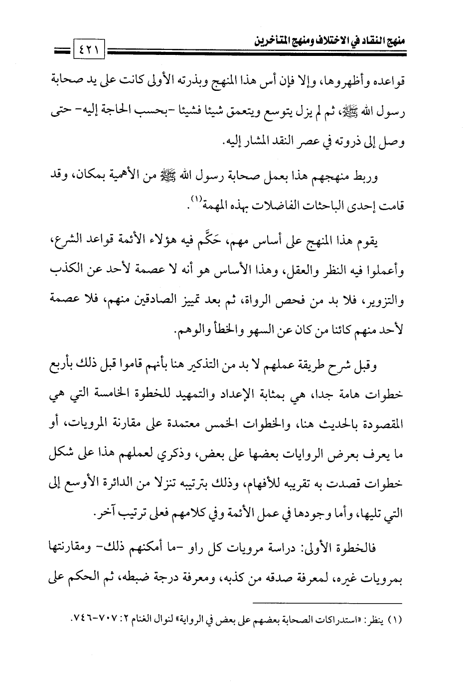 قواعده وأظهروها، وإلا فإن أس هذا المنهج وبذرته الأولى كانت على يد صحابة رسول الله - صلى الله عليه وسلم -، ثم لم يزل يتوسع ويتعمق شيئا فشيئا -بحسب الحاجة إليه- حتى وصل إلى ذروته في عصر النقد المشار إليه.