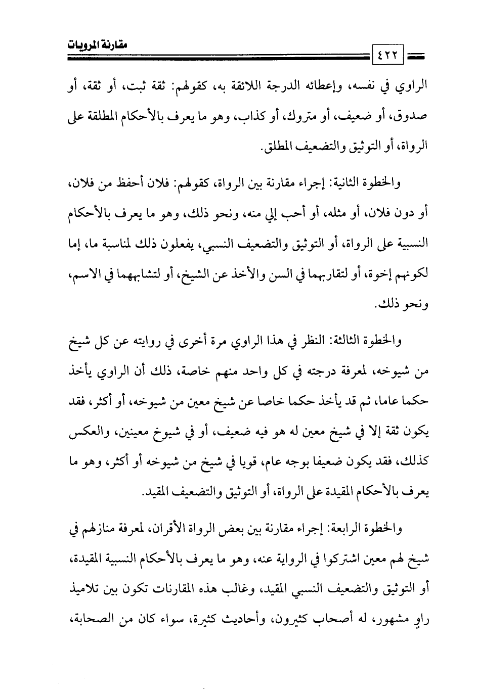 والخطوة الثانية: إجراء مقارنة بين الرواة، كقولهم: فلان أحفظ من فلان، أو دون فلان، أو مثله، أو أحب إلي منه، ونحو ذلك، وهو ما يعرف بالأحكام النسبية على الرواة، أو التوثيق والتضعيف النسبي، يفعلون ذلك لمناسبة ما، إما لكونهم إخوة، أو لتقاربهما في السن والأخذ عن الشيخ، أو لتشابههما في الاسم، ونحو ذلك.