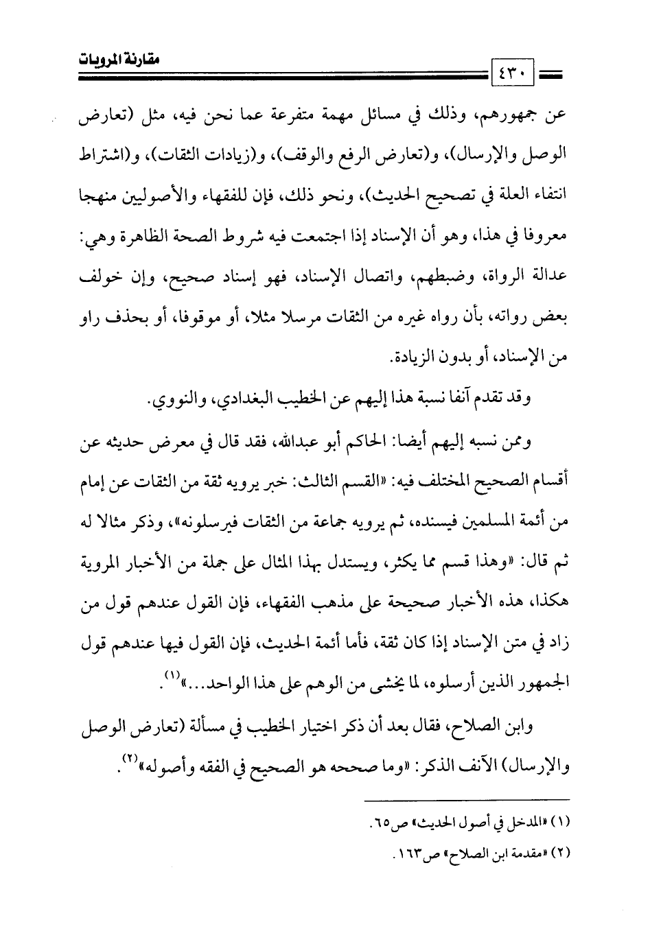 عن جمهورهم، وذلك في مسائل مهمة متفرعة عما نحن فيه، مثل (تعارض الوصل والإرسال)، و (تعارض الرفع والوقف)، و (زيادات الثقات)، و (اشتراط انتفاء العلة في تصحيح الحديث)، ونحو ذلك، فإن للفقهاء والأصوليين منهجا معروفا في هذا، وهو أن الإسناد إذا اجتمعت فيه شروط الصحة الظاهرة وهي: عدالة الرواة، وضبطهم، واتصال الإسناد، فهو إسناد صحيح، وإن خولف بعض رواته، بأن رواه غيره من الثقات مرسلا مثلا، أو موقوفا، أو بحذف راو من الإسناد، أو بدون الزيادة.