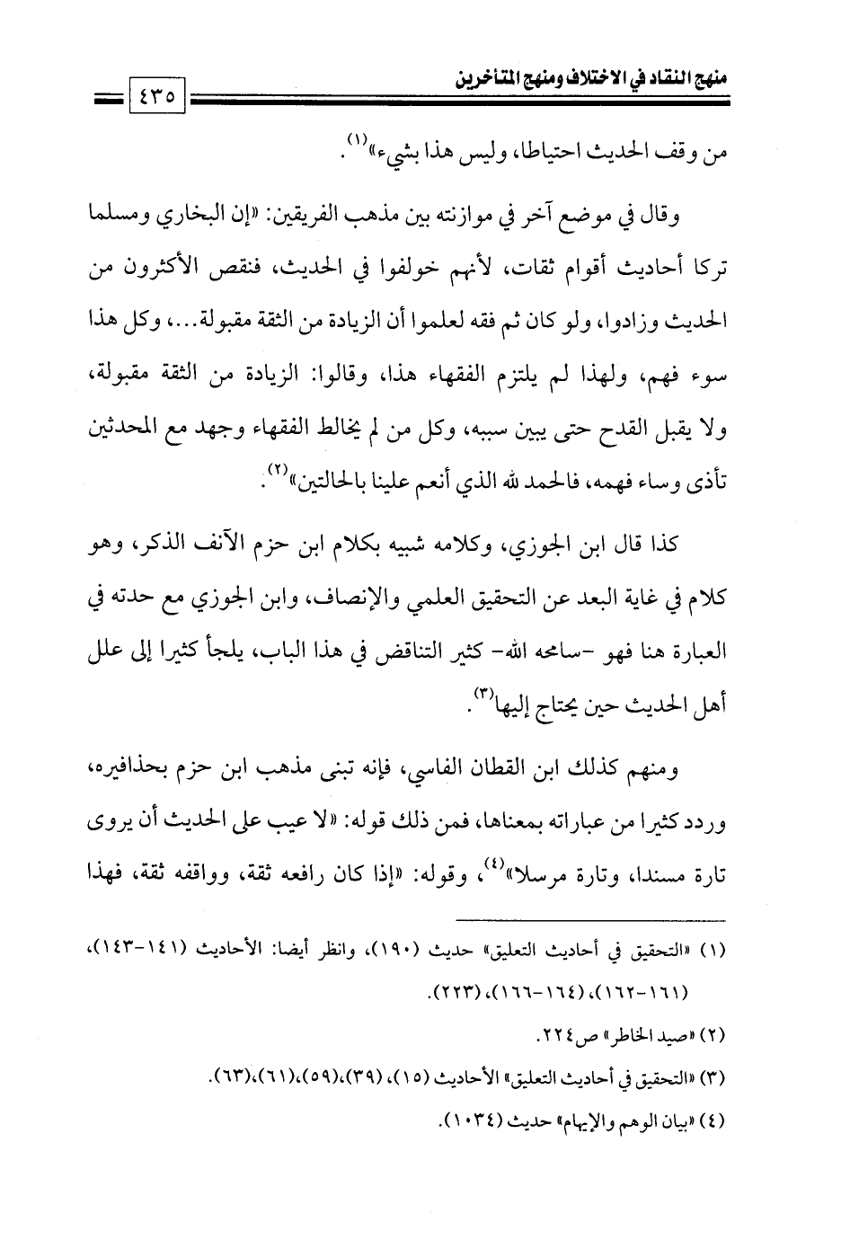 وقال في موضع آخر في موازنته بين مذهب الفريقين: «إن البخاري ومسلما تركا أحاديث أقوام ثقات، لأنهم خولفوا في الحديث، فنقص الأكثرون من الحديث وزادوا، ولو كان ثم فقه لعلموا أن الزيادة من الثقة مقبولة ... ، وكل هذا سوء فهم، ولهذا لم يلتزم الفقهاء هذا، وقالوا: الزيادة من الثقة مقبولة، ولا يقبل القدح حتى يبين سببه، وكل من لم يخالط الفقهاء وجهد مع المحدثين تأذى وساء فهمه، فالحمد لله الذي أنعم علينا بالحالتين» (¬٢).