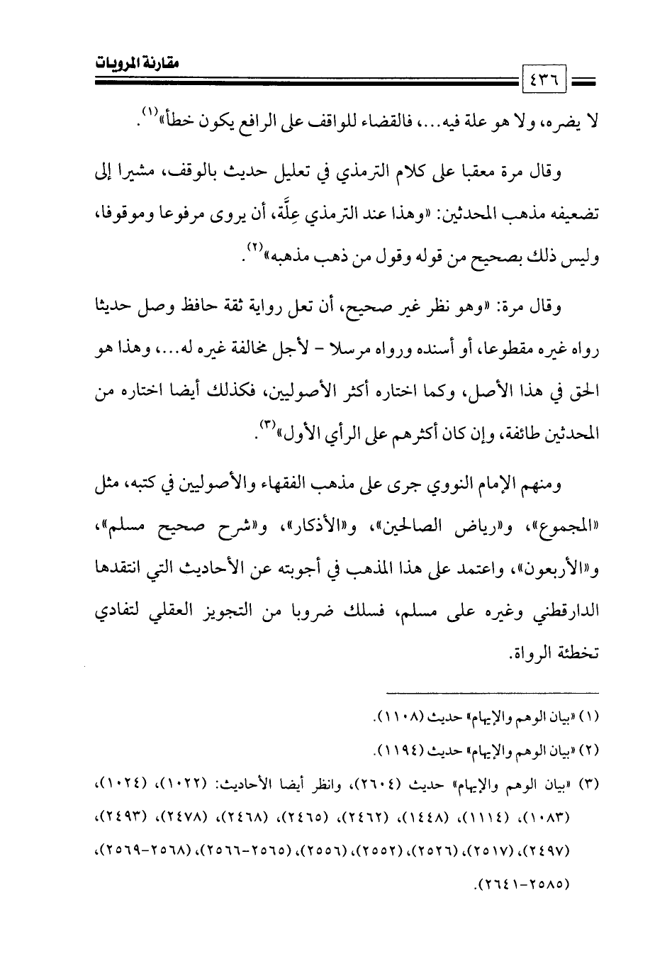 وقال مرة معقبا على كلام الترمذي في تعليل حديث بالوقف، مشيرا إلى تضعيفه مذهب المحدثين: «وهذا عند الترمذي عِلَّة، أن يروى مرفوعا وموقوفا، وليس ذلك بصحيح من قوله وقول من ذهب مذهبه» (¬٢).