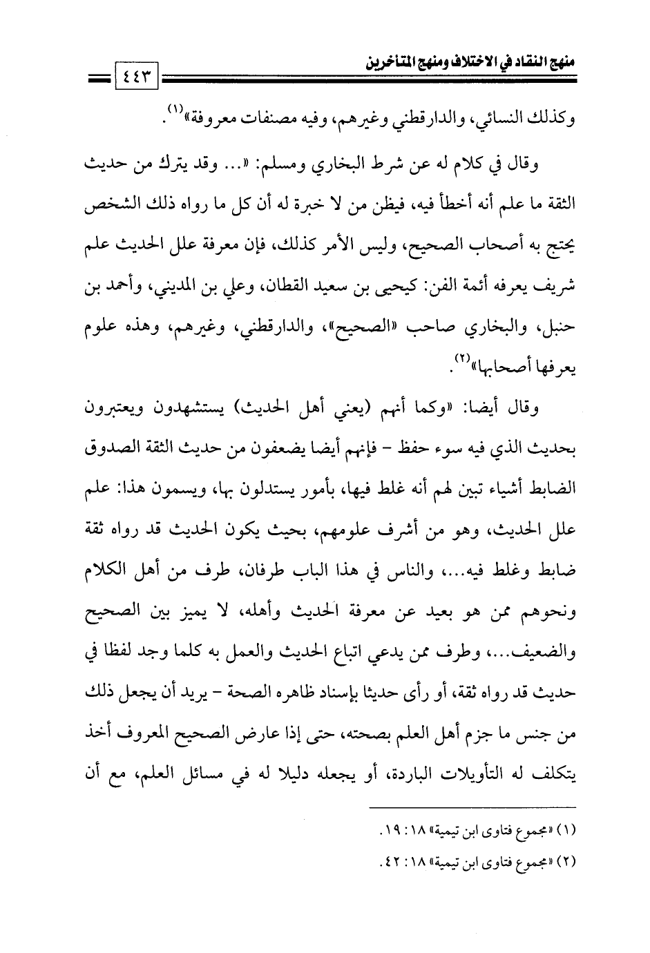 وقال أيضا: «وكما أنهم (يعني أهل الحديث) يستشهدون ويعتبرون بحديث الذي فيه سوء حفظ - فإنهم أيضا يضعفون من حديث الثقة الصدوق الضابط أشياء تبين لهم أنه غلط فيها، بأمور يستدلون بها، ويسمون هذا: علم علل الحديث، وهو من أشرف علومهم، بحيث يكون الحديث قد رواه ثقة ضابط وغلط فيه ... ، والناس في هذا الباب طرفان، طرف من أهل الكلام ونحوهم ممن هو بعيد عن معرفة الحديث وأهله، لا يميز بين الصحيح والضعيف ... ، وطرف ممن يدعي اتباع الحديث والعمل به كلما وجد لفظا في حديث قد رواه ثقة، أو رأى حديثا بإسناد ظاهره الصحة - يريد أن يجعل ذلك من جنس ما جزم أهل العلم بصحته، حتى إذا عارض الصحيح المعروف أخذ يتكلف له التأويلات الباردة، أو يجعله دليلا له في مسائل العلم، مع أن