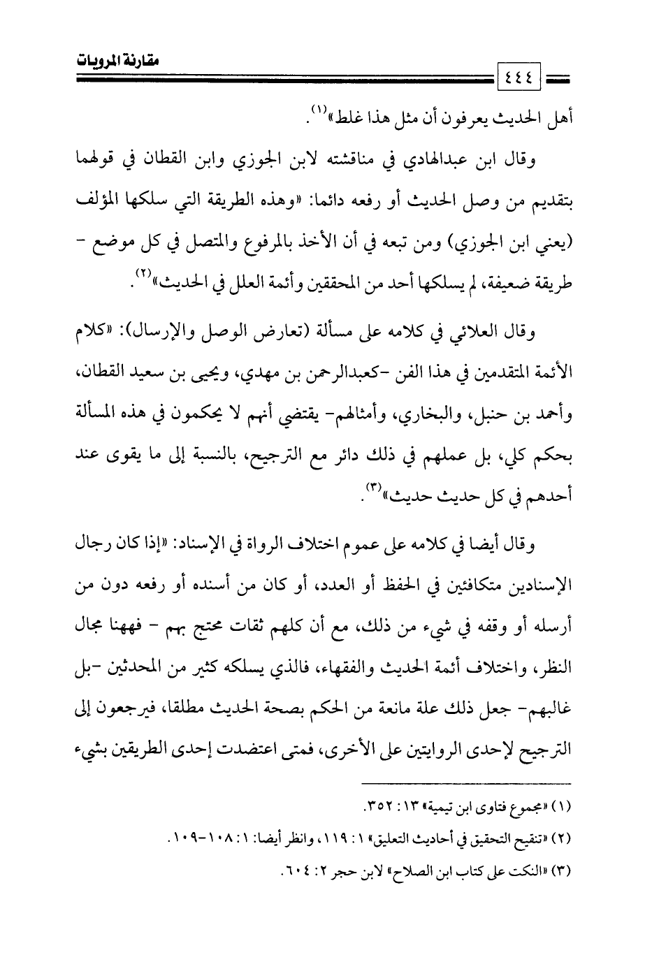 وقال العلائي في كلامه على مسألة (تعارض الوصل والإرسال): «كلام الأئمة المتقدمين في هذا الفن -كعبدالرحمن بن مهدي، ويحيى بن سعيد القطان، وأحمد بن حنبل، والبخاري، وأمثالهم- يقتضي أنهم لا يحكمون في هذه المسألة بحكم كلي، بل عملهم في ذلك دائر مع الترجيح، بالنسبة إلى ما يقوى عند أحدهم في كل حديث حديث» (¬٣).