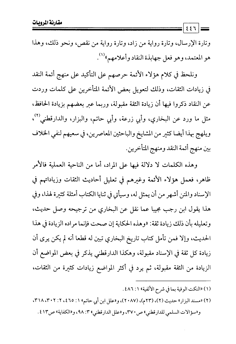 ونلحظ في كلام هؤلاء الأئمة حرصهم على التأكيد على منهج أئمة النقد في زيادات الثقات, وذلك لتعويل بعض الأئمة المتأخرين على كلمات وردت عن النقاد ذكروا فيها أن زيادة الثقة مقبولة, وربما عبر بعضهم بزيادة الحافظ, مثل ما ورد عن البخاري, وأبي زرعة، وأبي حاتم، والبزار، والدارقطني (¬٢)، ويلهج بهذا أيضا كثير من المشايخ والباحثين المعاصرين, في سعيهم لنفي الخلاف بين منهج أئمة النقد ومنهج المتأخرين.
