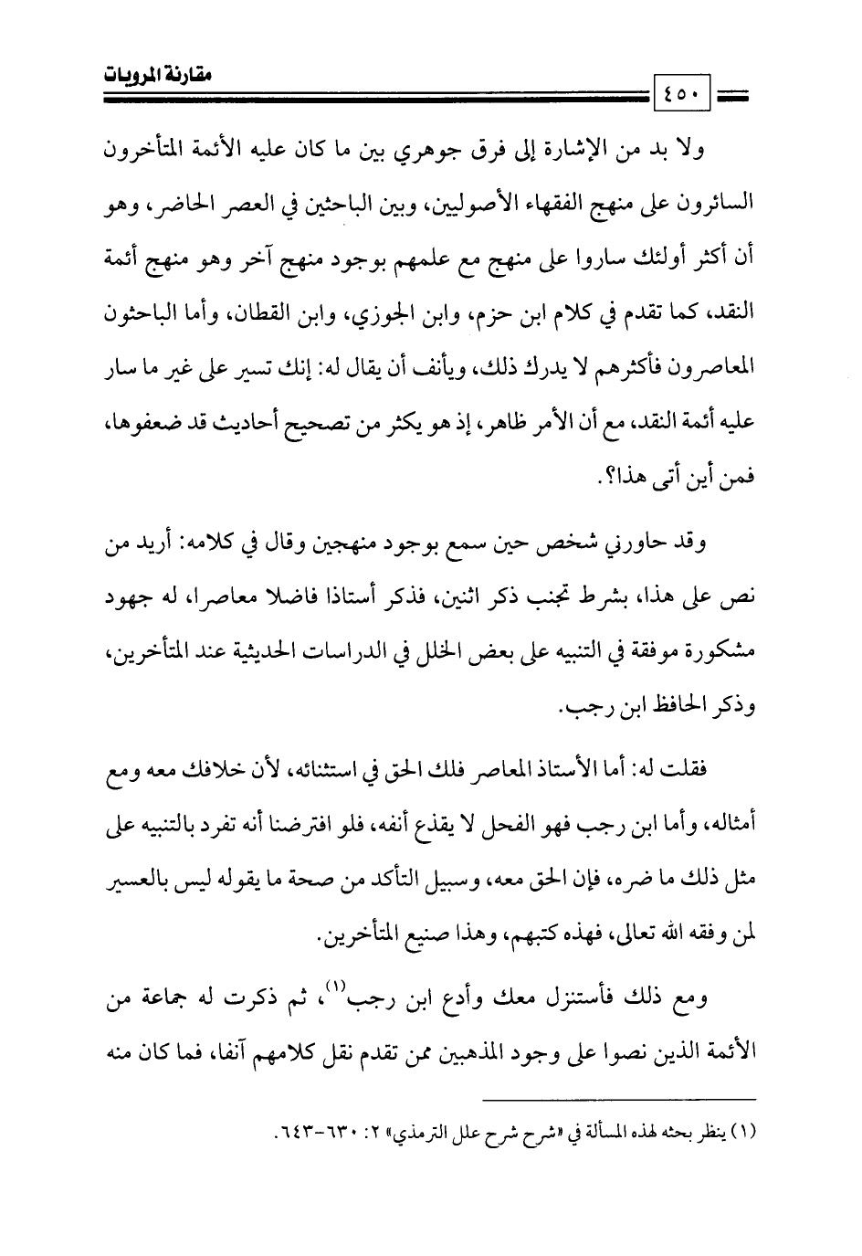 وقد حاورني شخص حين سمع بوجود منهجين وقال في كلامه: أريد من نص على هذا، بشرط تجنب ذكر اثنين، فذكر أستاذا فاضلا معاصرا، له جهود مشكورة موفقة في التنبيه على بعض الخلل في الدراسات الحديثية عند المتأخرين، وذكر الحافظ ابن رجب.