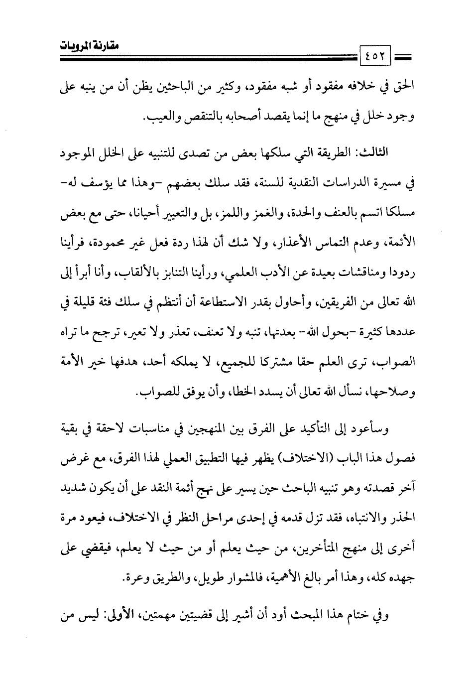 الثالث: الطريقة التي سلكها بعض من تصدى للتنبيه على الخلل الموجود في مسيرة الدراسات النقدية للسنة، فقد سلك بعضهم -وهذا مما يؤسف له- مسلكا اتسم بالعنف والحدة، والغمز واللمز، بل والتعيير أحيانا، حتى مع بعض الأئمة، وعدم التماس الأعذار، ولا شك أن لهذا ردة فعل غير محمودة، فرأينا ردودا ومناقشات بعيدة عن الأدب العلمي، ورأينا التنابز بالألقاب، وأنا أبرأ إلى الله تعالى من الفريقين، وأحاول بقدر الاستطاعة أن أنتظم في سلك فئة قليلة في عددها كثيرة -بحول الله- بعدتها، تنبه ولا تعنف، تعذر ولا تعير، ترجح ما تراه الصواب، ترى العلم حقا مشتركا للجميع، لا يملكه أحد، هدفها خير الأمة وصلاحها، نسأل الله تعالى أن يسدد الخطا، وأن يوفق للصواب.