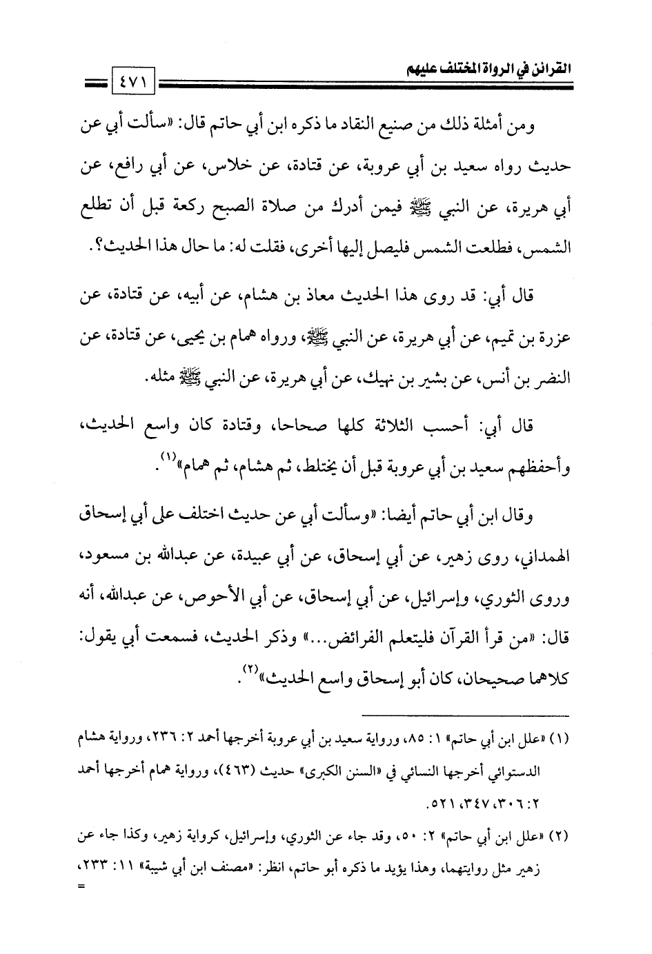 (¬١) «علل ابن أبي حاتم» ١: ٨٥، ورواية سعيد بن أبي عروبة أخرجها أحمد ٢: ٢٣٦، ورواية هشام الدستوائي أخرجها النسائي في «السنن الكبرى» حديث (٤٦٣)، ورواية همام أخرجها أحمد ٢: ٣٠٦، ٣٤٧، ٥٢١.