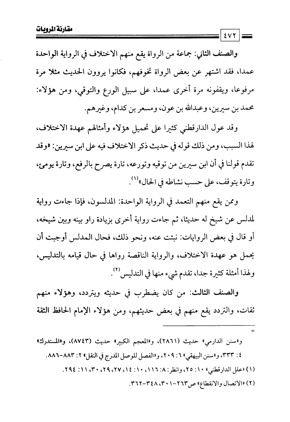 والصنف الثاني: جماعة من الرواة يقع منهم الاختلاف في الرواية الواحدة عمدا، فقد اشتهر عن بعض الرواة تخوفهم، فكانوا يروون الحديث مثلا مرة مرفوعا، ويقفونه مرة أخرى عمدا، على سبيل الورع والتوقي، ومن هؤلاء: محمد بن سيرين، وعبدالله بن عون، ومسعر بن كدام، وغيرهم.