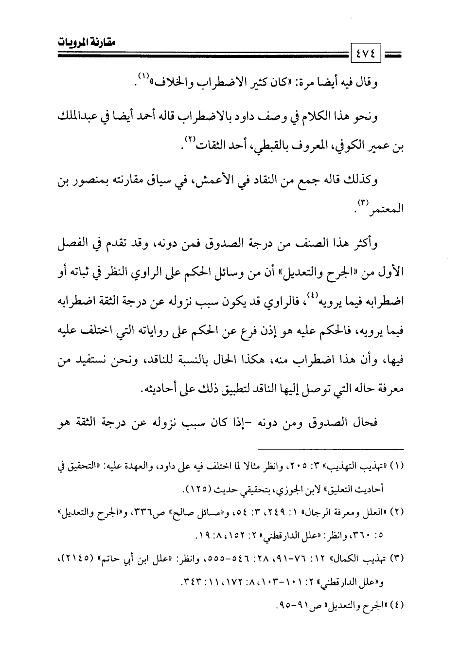 وأكثر هذا الصنف من درجة الصدوق فمن دونه, وقد تقدم في الفصل الأول من «الجرح والتعديل» أن من وسائل الحكم على الراوي النظر في ثباته أو اضطرابه فيما يرويه (¬٤)، فالراوي قد يكون سبب نزوله عن درجة الثقة اضطرابه فيما يرويه، فالحكم عليه هو إذن فرع عن الحكم على رواياته التي اختلف عليه فيها، وأن هذا اضطراب منه، هكذا الحال بالنسبة للناقد، ونحن نستفيد من معرفة حاله التي توصل إليها الناقد لتطبيق ذلك على أحاديثه.