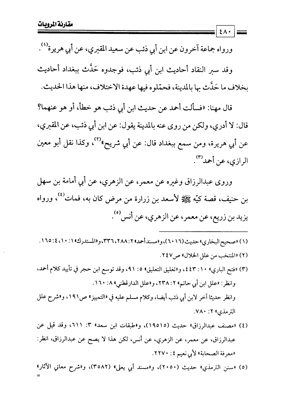 (¬٣) «فتح الباري» ١٠: ٤٤٣، و «تغليق التعليق» ٥: ٩١، وقد توسع ابن حجر في تأييد كلام أحمد، وانظر: «علل ابن أبي حاتم» ٢: ٢٣٨، و «علل الدارقطني» ٨: ١٦٠.