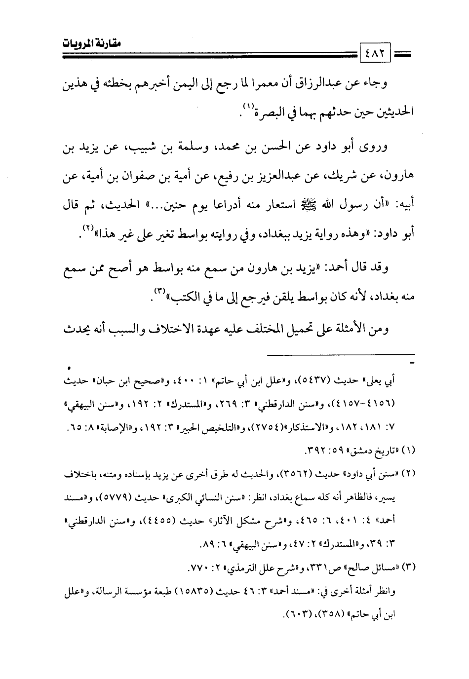 وروى أبو داود عن الحسن بن محمد، وسلمة بن شبيب، عن يزيد بن هارون، عن شريك، عن عبدالعزيز بن رفيع، عن أمية بن صفوان بن أمية، عن أبيه: «أن رسول الله - صلى الله عليه وسلم - استعار منه أدراعا يوم حنين ... » الحديث، ثم قال أبو داود: «وهذه رواية يزيد ببغداد، وفي روايته بواسط تغير على غير هذا» (¬٢).