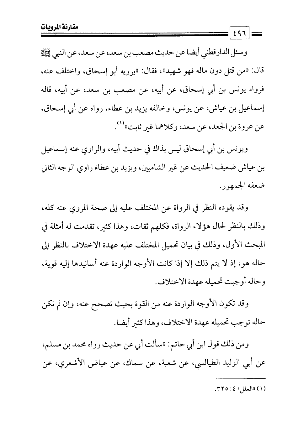 وسئل الدارقطني أيضا عن حديث مصعب بن سعد، عن سعد، عن النبي - صلى الله عليه وسلم - قال: «من قتل دون ماله فهو شهيد»، فقال: «يرويه أبو إسحاق، واختلف عنه، فرواه يونس بن أبي إسحاق، عن أبيه، عن مصعب بن سعد، عن أبيه، قاله إسماعيل بن عياش، عن يونس، وخالفه يزيد بن عطاء، رواه عن أبي إسحاق، عن عروة بن الجعد، عن سعد، وكلاهما غير ثابت» (¬١).