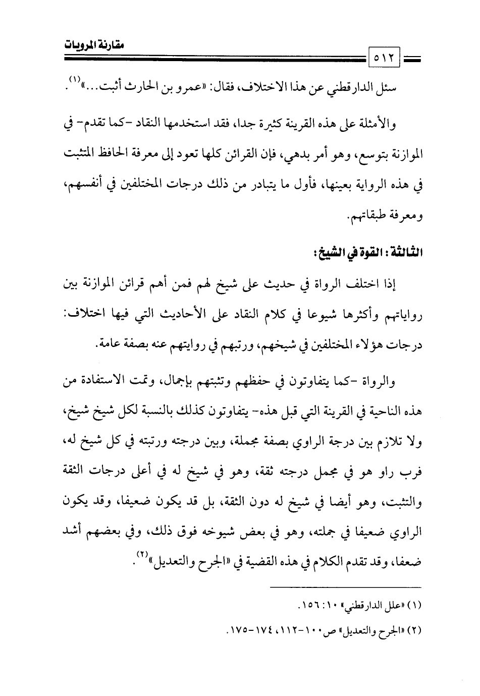 والرواة -كما يتفاوتون في حفظهم وتثبتهم بإجمال، وتمت الاستفادة من هذه الناحية في القرينة التي قبل هذه- يتفاوتون كذلك بالنسبة لكل شيخ شيخ، ولا تلازم بين درجة الراوي بصفة مجملة، وبين درجته ورتبته في كل شيخ له، فرب راو هو في مجمل درجته ثقة، وهو في شيخ له في أعلى درجات الثقة والتثبت، وهو أيضا في شيخ له دون الثقة، بل قد يكون ضعيفا، وقد يكون الراوي ضعيفا في جملته، وهو في بعض شيوخه فوق ذلك، وفي بعضهم أشد ضعفا، وقد تقدم الكلام في هذه القضية في «الجرح والتعديل» (¬٢).