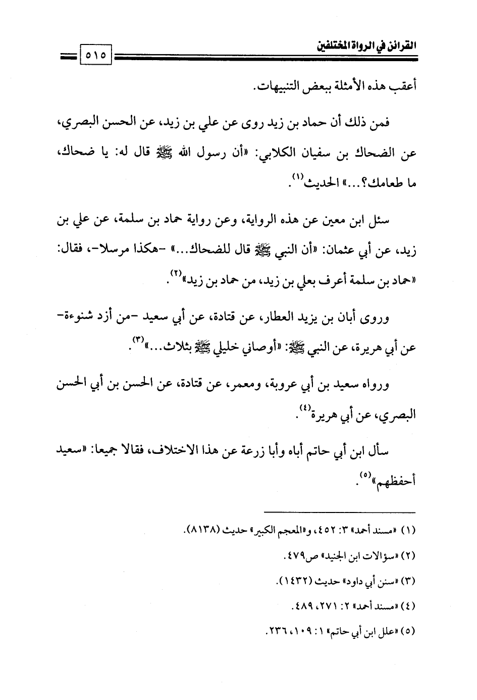 سئل ابن معين عن هذه الرواية، وعن رواية حماد بن سلمة، عن علي بن زيد، عن أبي عثمان: «أن النبي - صلى الله عليه وسلم - قال للضحاك ... » -هكذا مرسلا-، فقال: «حماد بن سلمة أعرف بعلي بن زيد، من حماد بن زيد» (¬٢).