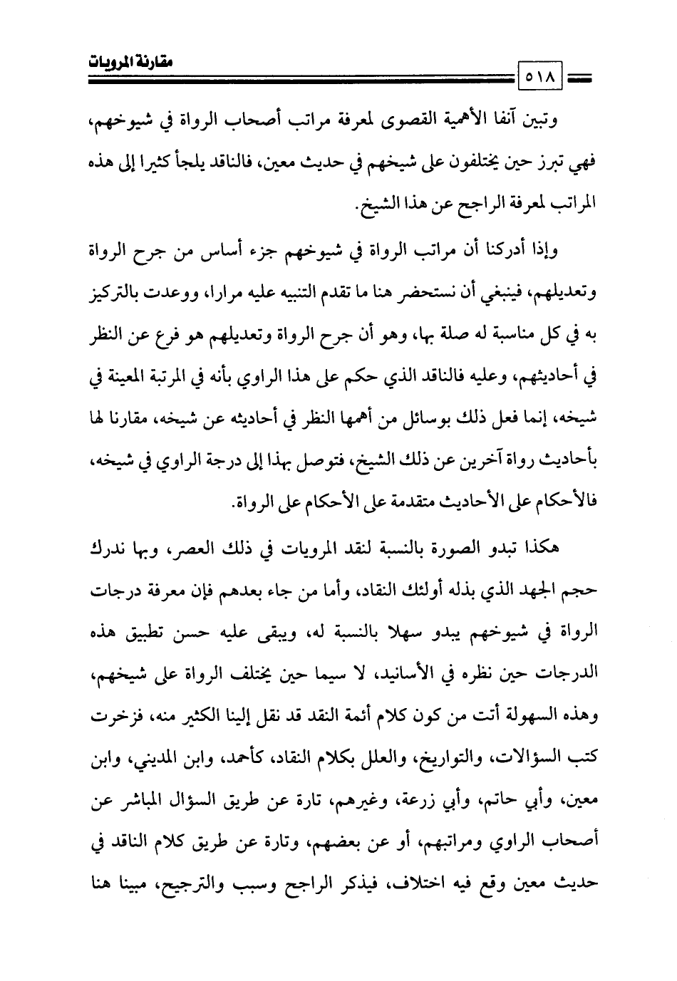 وإذا أدركنا أن مراتب الرواة في شيوخهم جزء أساس من جرح الرواة وتعديلهم، فينبغي أن نستحضر هنا ما تقدم التنبيه عليه مرارا، ووعدت بالتركيز به في كل مناسبة له صلة بها، وهو أن جرح الرواة وتعديلهم هو فرع عن النظر في أحاديثهم، وعليه فالناقد الذي حكم على هذا الراوي بأنه في المرتبة المعينة في شيخه، إنما فعل ذلك بوسائل من أهمها النظر في أحاديثه عن شيخه، مقارنا لها بأحاديث رواة آخرين عن ذلك الشيخ، فتوصل بهذا إلى درجة الراوي في شيخه، فالأحكام على الأحاديث متقدمة على الأحكام على الرواة.