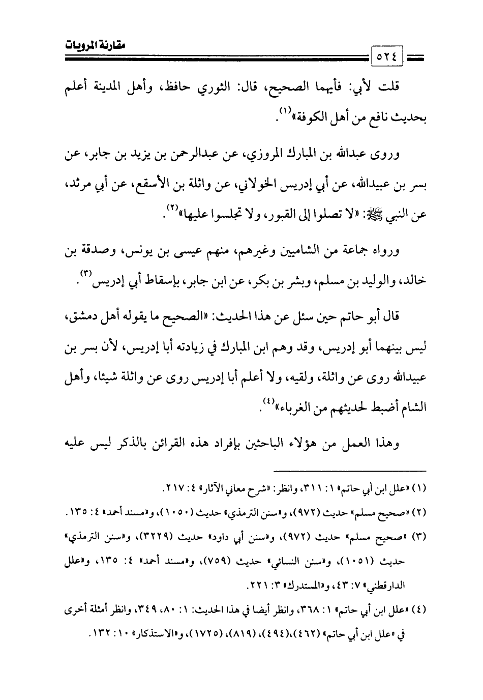 (¬٤) «علل ابن أبي حاتم» ١: ٣٦٨، وانظر أيضا في هذا الحديث: ١: ٨٠، ٣٤٩، وانظر أمثلة أخرى في «علل ابن أبي حاتم» (٤٦٢) , (٤٩٤)، (٨١٩) , (١٧٢٥) , و «الاستذكار» ١٠: ١٣٢.