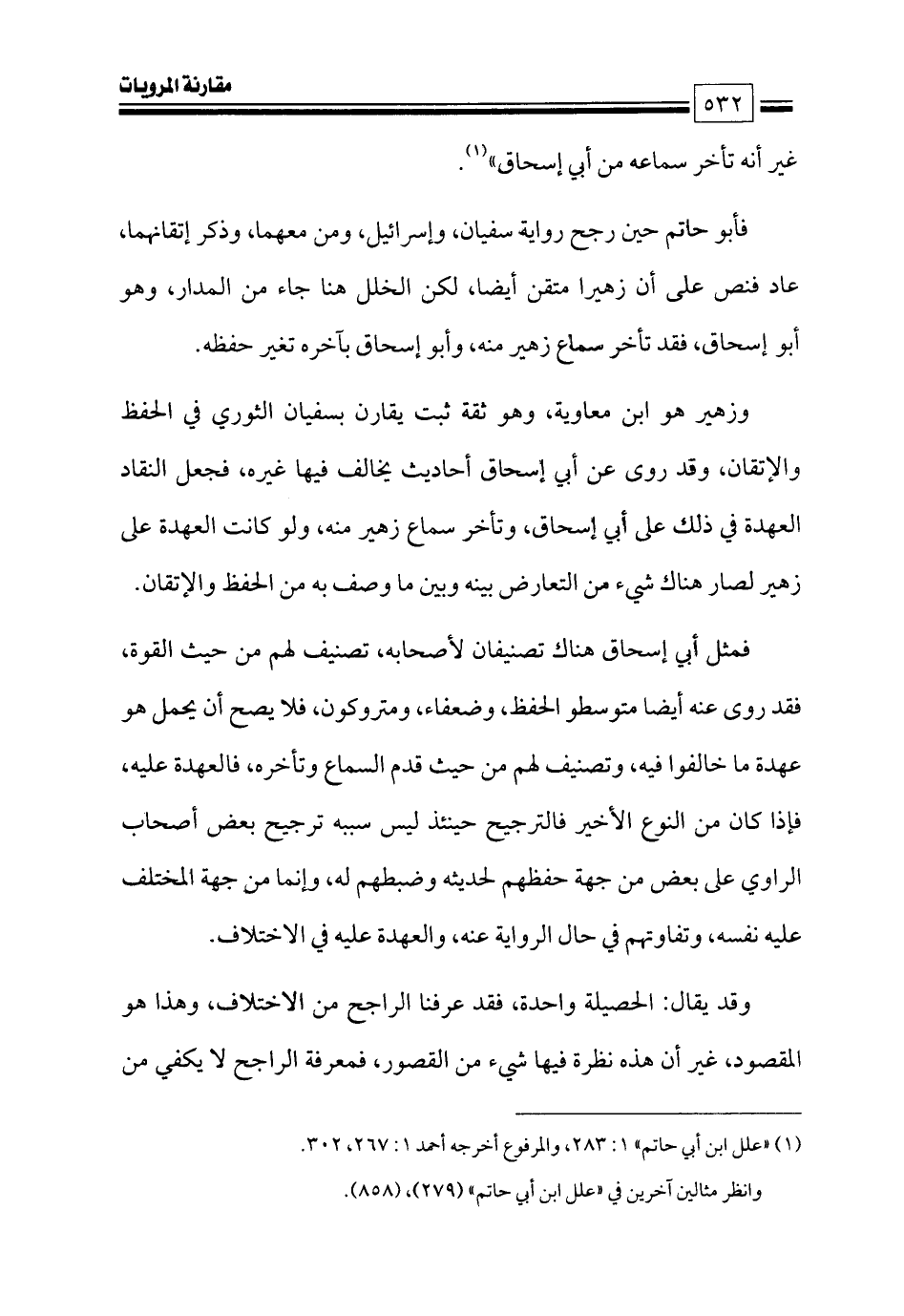 فأبو حاتم حين رجح رواية سفيان، وإسرائيل، ومن معهما، وذكر إتقانهما، عاد فنص على أن زهيرا متقن أيضا، لكن الخلل هنا جاء من المدار، وهو أبو إسحاق، فقد تأخر سماع زهير منه، وأبو إسحاق بآخره تغير حفظه.