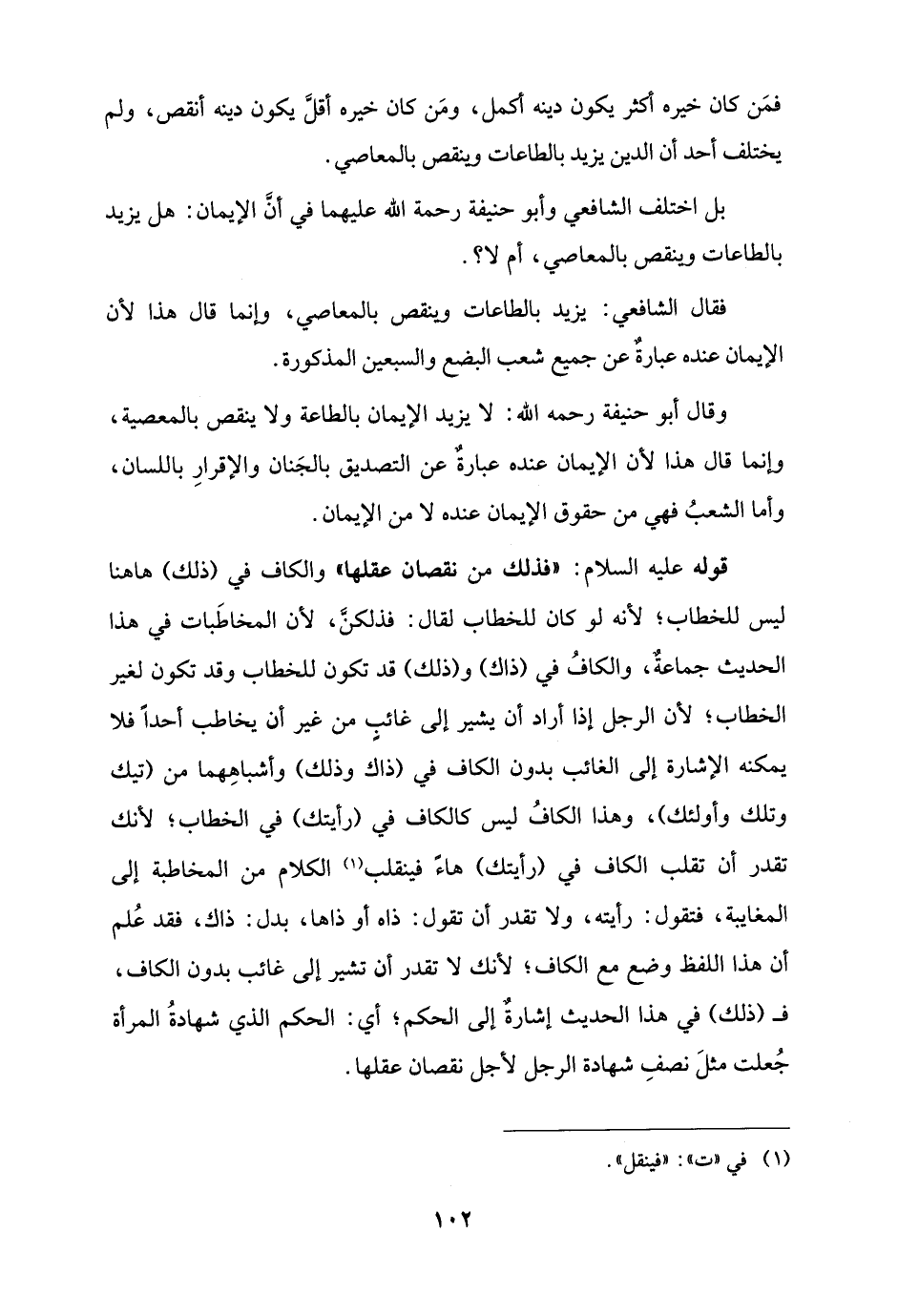 فقال الشافعي: يزيد بالطاعات وينقص بالمعاصي، وإنما قال هذا لأن الإيمان عنده عبارةٌ عن جميع شعب البضع والسبعين المذكورة.