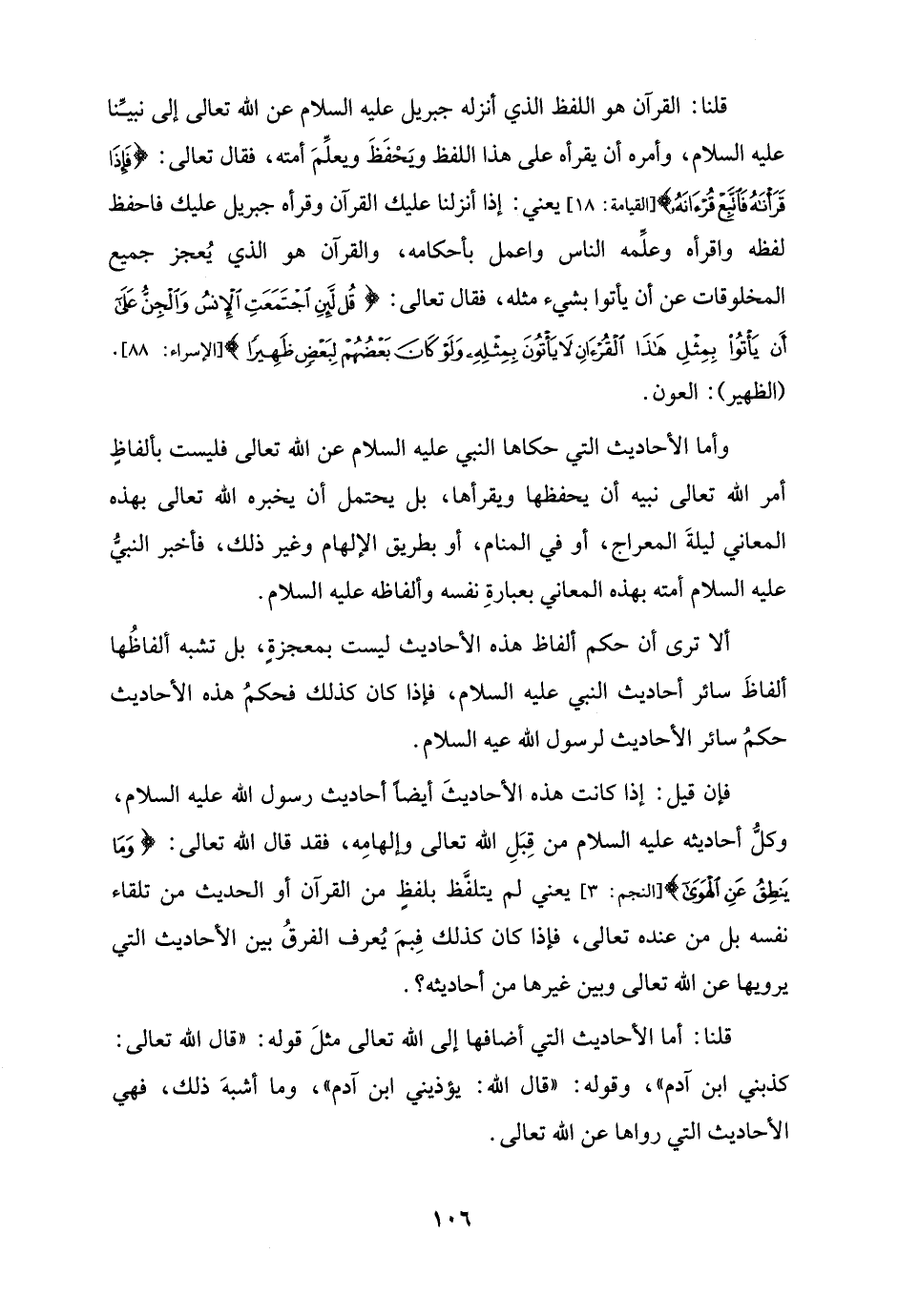 وأما الأحاديث التي حكاها النبي عليه السلام عن الله تعالى فليست بألفاظٍ أمر الله تعالى نبيه أن يحفظها ويقرأها، بل يحتمل أن يخبره الله تعالى بهذه المعاني ليلةَ المعراج، أو في المنام، أو بطريق الإلهام وغير ذلك، فأخبر النبيُّ عليه السلام أمته بهذه المعاني بعبارةِ نفسه وألفاظه عليه السلام.