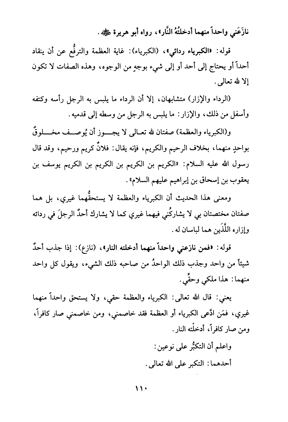 ومعنى هذا الحديث أن الكبرياء والعظمة لا يستحقُهما غيري، بل هما صفتان مختصتان بي لا يشاركُني فيهما غيري كما لا يشارك أحدٌ الرجلَ في ردائه وإزاره اللَّذَين هما لباسان له.