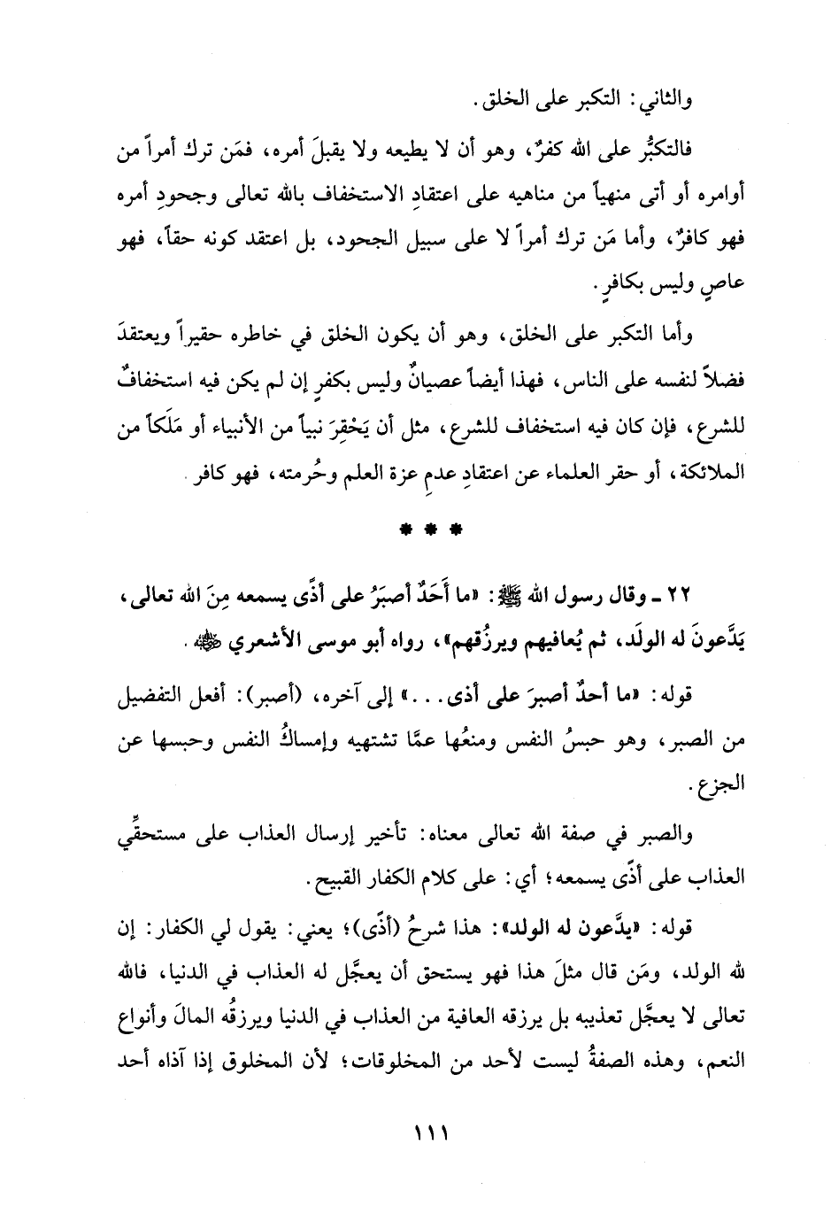 22 - وقال رسول الله - صلى الله عليه وسلم -: "ما أَحَدٌ أصبَرُ على أذًى يسمعه مِنَ الله تعالى، يَدَّعونَ له الولَد، ثم يُعافيهم ويرزُقهم"، رواه أبو موسى الأشعري - رضي الله عنه -.