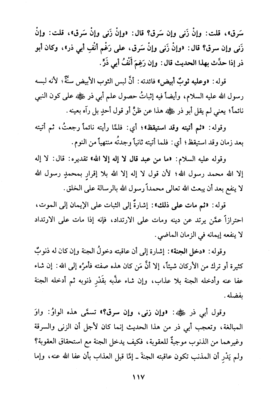 سَرق"، قلت: وإنْ زَنى وإن سَرق؟ قال: "وإنْ زَنى وإنْ سَرق"، قلت: وإنْ زَنى وإن سرق؟ قال: "وإنْ زَنى وإنْ سَرق، على رَغْم أنْفِ أبي ذر"، وكان أبو ذر إذا حدَّث بهذا الحديث قال: وإن رَغِمَ أَنْفُ أبي ذَرٍّ.