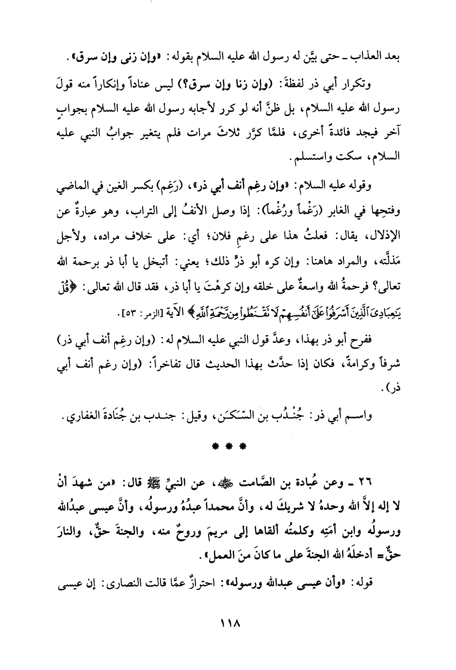 26 - وعن عُبادة بن الصَّامت - رضي الله عنه -، عن النبيِّ - صلى الله عليه وسلم - قال: "من شهدَ أنْ لا إله إلاَّ الله وحدهُ لا شريكَ له، وأنَّ محمدًا عبدُهُ ورسولُه، وأنَّ عيسى عبدُ الله ورسولُه وابن أمَتِه وكلمتُه ألقاها إلى مريمَ وروحٌ منه، والجنةَ حقٌّ، والنارَ حقٌّ = أدخلَهُ الله الجنةَ على ما كانَ منَ العمل".