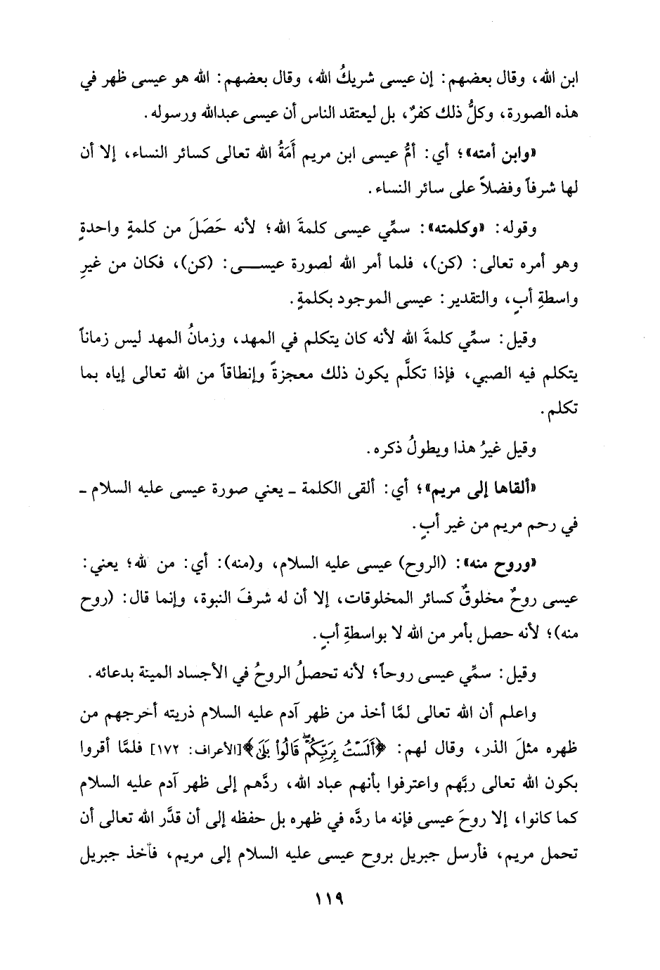 واعلم أن الله تعالى لمَّا أخذ من ظهر آدم عليه السلام ذريته أخرجهم من ظهره مثلَ الذر، وقال لهم: {أَلَسْتُ بِرَبِّكُمْ قَالُوا بَلَى} [الأعراف: 172] فلمَّا أقروا بكون الله تعالى ربَّهم واعترفوا بأنهم عباد الله، ردَّهم إلى ظهر آدم عليه السلام كما كانوا، إلا روحَ عيسى فإنه ما ردَّه في ظهره بل حفظه إلى أن قدَّر الله تعالى أن تحمل مريم، فأرسل جبريل بروح عيسى عليه السلام إلى مريم، فأخذ جبريل