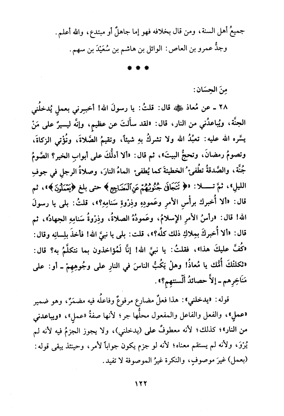 28 - عن مُعاذ - رضي الله عنه - قال: قلتُ: يا رسولَ الله! أخبِرني بعملٍ يُدخلُني الجنَّة، ويُباعدُني من النار، قال: "لقد سأَلتَ عن عظيمٍ، وإنَّه ليسيرٌ على مَنْ يسَّره الله عليه: تعبُدُ الله ولا تشركُ بهِ شيئًا، وتقيمُ الصَّلاةَ، وتُؤْتي الزكاةَ، وتصومُ رمضانَ، وتحجُّ البيتَ"، ثم قال: "ألا أدلُّكَ على أبوابِ الخير؟ الصَّومُ جُنَّة، والصَّدقةُ تُطفئُ الخطيئةَ كما يُطفئ الماءُ النارَ، وصلاةُ الرجلِ في جوفِ الليلِ"، ثمَّ تلا: " {تَتَجَافَى جُنُوبُهُمْ عَنِ الْمَضَاجِعِ} حتى بلغ {يَعْمَلُونَ} "، ثم قال: "ألا أُخبرك برأْسِ الأمرِ وعَمودِهِ وذِرْوةِ سَنامِهِ؟ "، قلتُ: بلى يا رسولَ الله! قال: "رأسُ الأمرِ الإسلامُ، وعَمودُهُ الصلاةُ، وذِرْوةُ سَنامِهِ الجهادُ"، ثم قال: "ألا أُخبركَ بمِلاكِ ذلك كلِّه؟ "، قلت: بلى يا نبيَّ الله! فأخذَ بلِسانِه وقال: "كُفَّ عليكَ هذا"، فقلتُ: يا نبيَّ الله! إنَّا لَمُؤاخذون بما نتكلَّمُ به؟ قال: "ثكلتْكَ أُمُّك يا مُعاذُ! وهلْ يَكُبُّ الناسَ في النارِ على وجُوهِهِمْ - أو: على مَنَاخِرِهم - إلاَّ حصائدُ أَلْسنتهِمِ؟ ".