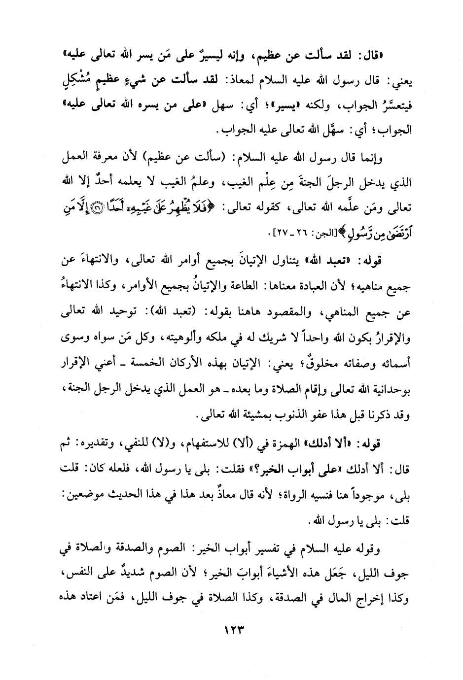 وإنما قال رسول الله عليه السلام: (سألت عن عظيم) لأن معرفة العمل الذي يدخل الرجلَ الجنةَ مِن عِلْم الغيب، وعلمُ الغيب لا يعلمه أحدٌ إلا الله تعالى ومَن علَّمه الله تعالى، كقوله تعالى: {فَلَا يُظْهِرُ عَلَى غَيْبِهِ أَحَدًا (26) إِلَّا مَنِ ارْتَضَى مِنْ رَسُولٍ} [الجن: 26 - 27].