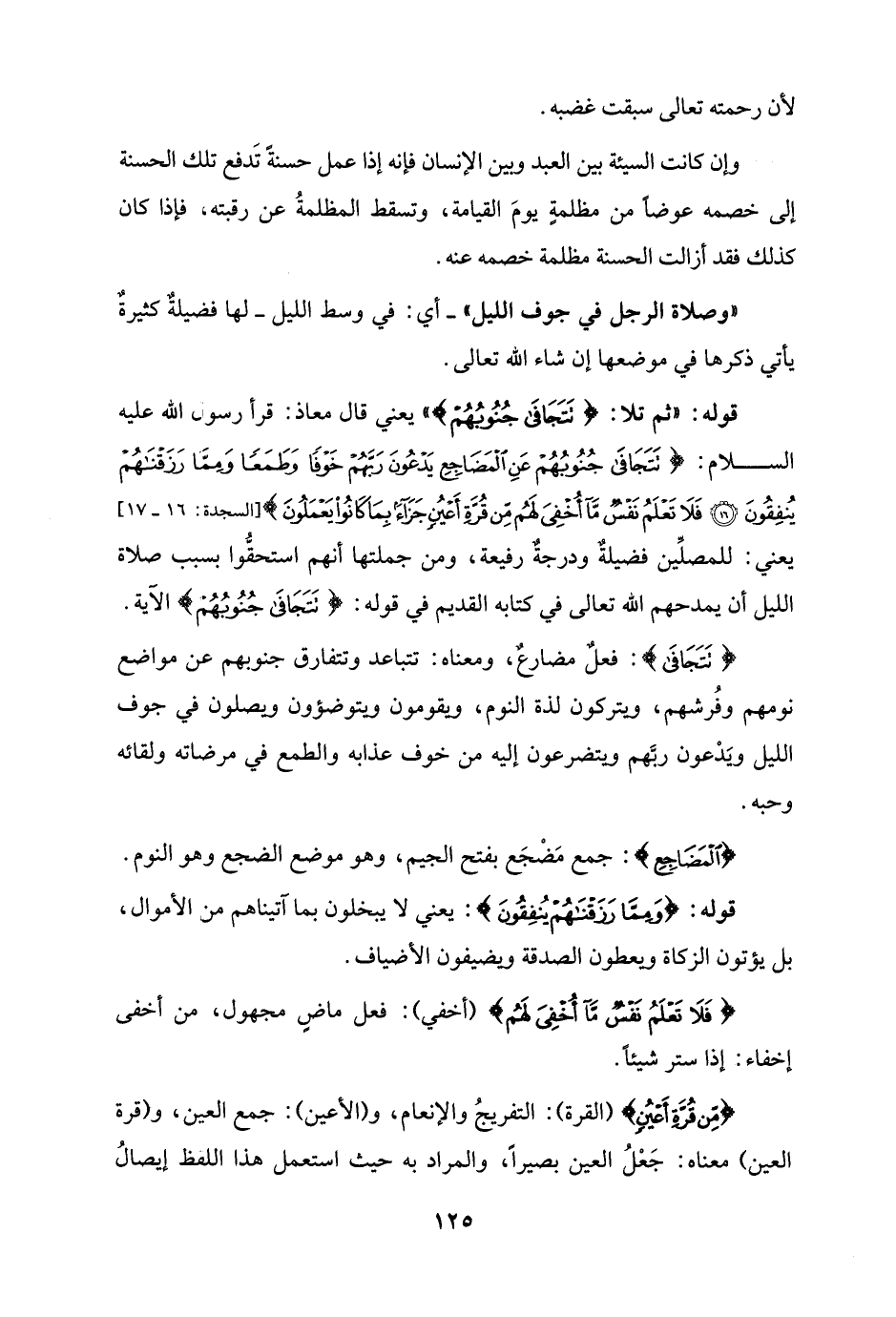 قوله: "ثم تلا: {تَتَجَافَى جُنُوبُهُمْ} " يعني قال معاذ: قرأ رسول الله عليه السلام: {تَتَجَافَى جُنُوبُهُمْ عَنِ الْمَضَاجِعِ يَدْعُونَ رَبَّهُمْ خَوْفًا وَطَمَعًا وَمِمَّا رَزَقْنَاهُمْ يُنْفِقُونَ (16) فَلَا تَعْلَمُ نَفْسٌ مَا أُخْفِيَ لَهُمْ مِنْ قُرَّةِ أَعْيُنٍ جَزَاءً بِمَا كَانُوا يَعْمَلُونَ} [السجدة: 16 - 17] يعني: للمصلِّين فضيلةٌ ودرجةٌ رفيعة، ومن جملتها أنهم استحقُّوا بسبب صلاة الليل أن يمدحهم الله تعالى في كتابه القديم في قوله: {تَتَجَافَى جُنُوبُهُمْ} الآية.