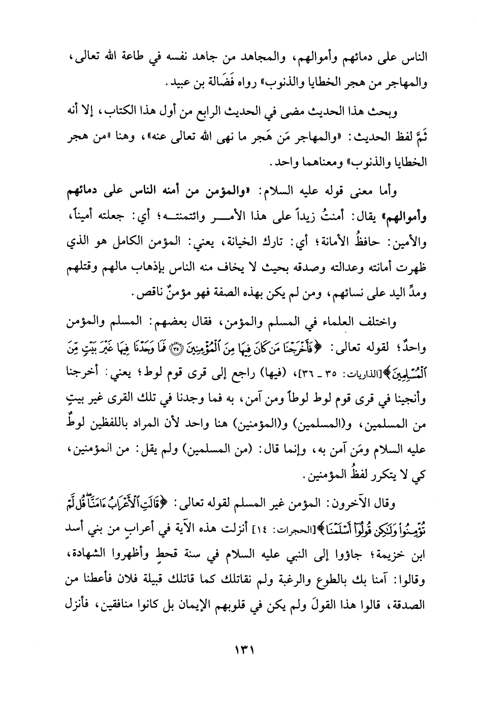 واختلف العلماء في المسلم والمؤمن، فقال بعضهم: المسلم والمؤمن واحدٌ؛ لقوله تعالى: {فَأَخْرَجْنَا مَنْ كَانَ فِيهَا مِنَ الْمُؤْمِنِينَ (35) فَمَا وَجَدْنَا فِيهَا غَيْرَ بَيْتٍ مِنَ الْمُسْلِمِينَ} [الذاريات: 35 - 36]، (فيها) راجع إلى قرى قوم لوط؛ يعني: أخرجنا وأنجينا في قرى قوم لوط لوطًا ومن آمن، به فما وجدنا في تلك القرى غير بيتٍ من المسلمين، و (المسلمين) و (المؤمنين) هنا واحد لأن المراد باللفظين لوطٌ عليه السلام ومَن آمن به، وإنما قال: (من المسلمين) ولم يقل: من المؤمنين، كي لا يتكرر لفظُ المؤمنين.