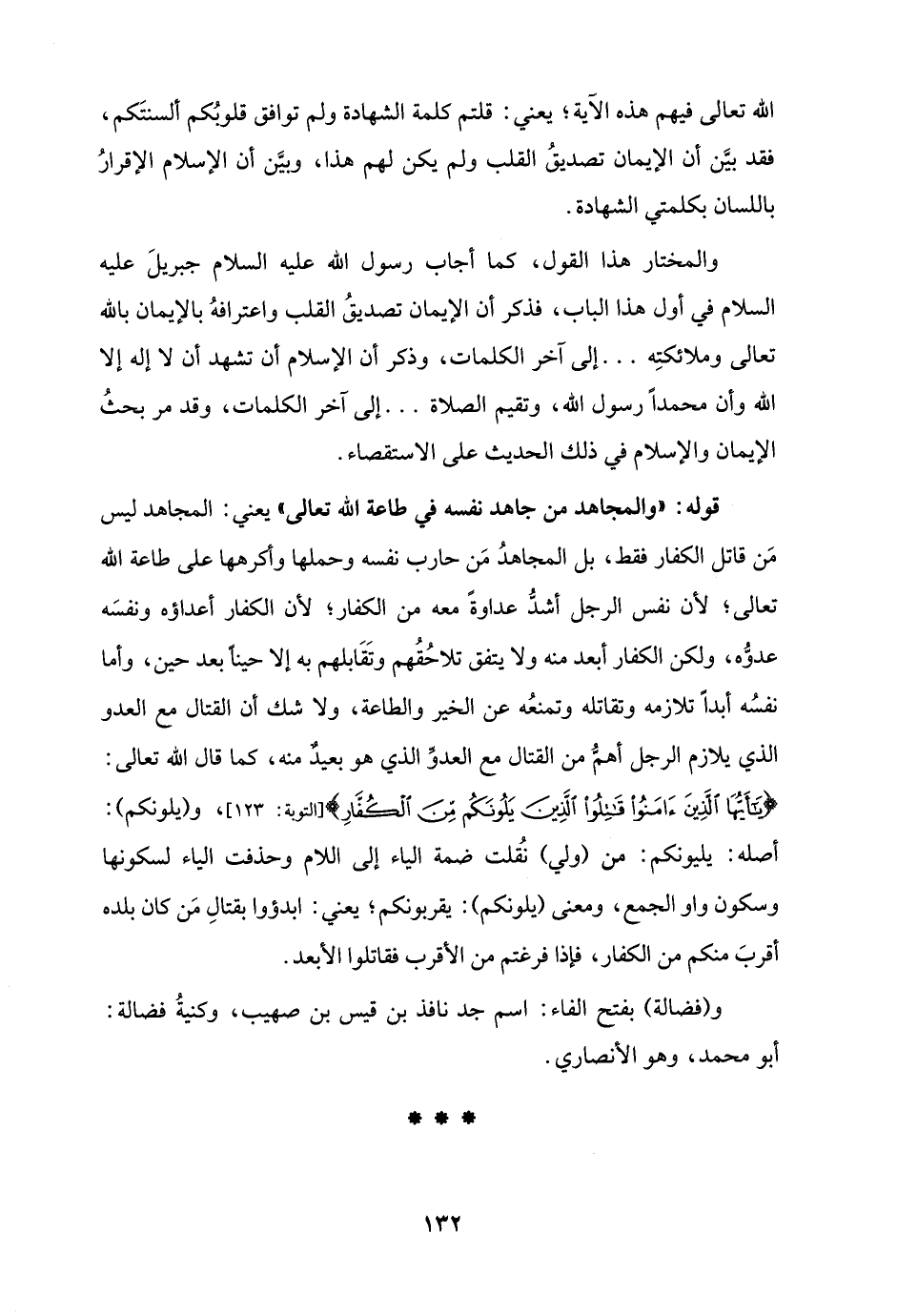 قوله: "والمجاهد من جاهد نفسه في طاعة الله تعالى" يعني: المجاهد ليس مَن قاتل الكفار فقط، بل المجاهدُ مَن حارب نفسه وحملها وأكرهها على طاعة الله تعالى؛ لأن نفس الرجل أشدُّ عداوةً معه من الكفار؛ لأن الكفار أعداؤه ونفسَه عدوُّه، ولكن الكفار أبعد منه ولا يتفق تلاحُقُهم وتَقَابلهم به إلا حينًا بعد حين، وأما نفسُه أبدًا تلازمه وتقاتله وتمنعُه عن الخير والطاعة، ولا شك أن القتال مع العدو الذي يلازم الرجل أهمُّ من القتال مع العدوِّ الذي هو بعيدٌ منه، كما قال الله تعالى: {يَاأَيُّهَا الَّذِينَ آمَنُوا قَاتِلُوا الَّذِينَ يَلُونَكُمْ مِنَ الْكُفَّارِ} [التوبة: 123]، و (يلونكم): أصله: يليونكم: من (ولي) نُقلت ضمة الياء إلى اللام وحذفت الياء لسكونها وسكون واو الجمع، ومعنى (يلونكم): يقربونكم؛ يعني: ابدؤوا بقتالِ مَن كان بلده أقربَ منكم من الكفار، فإذا فرغتم من الأقرب فقاتلوا الأبعد.
