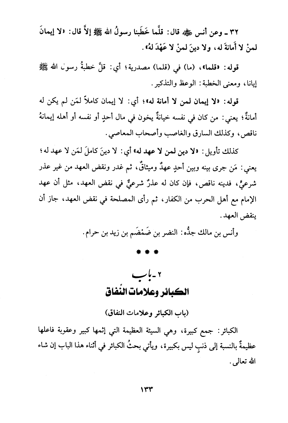 32 - وعن أنس - رضي الله عنه - قال: قلَّما خَطَبنا رسولُ الله - صلى الله عليه وسلم - إلاَّ قال: "لا إيمانَ لمنْ لا أَمانةَ له، ولا دينَ لمنْ لا عَهْدَ لهُ".