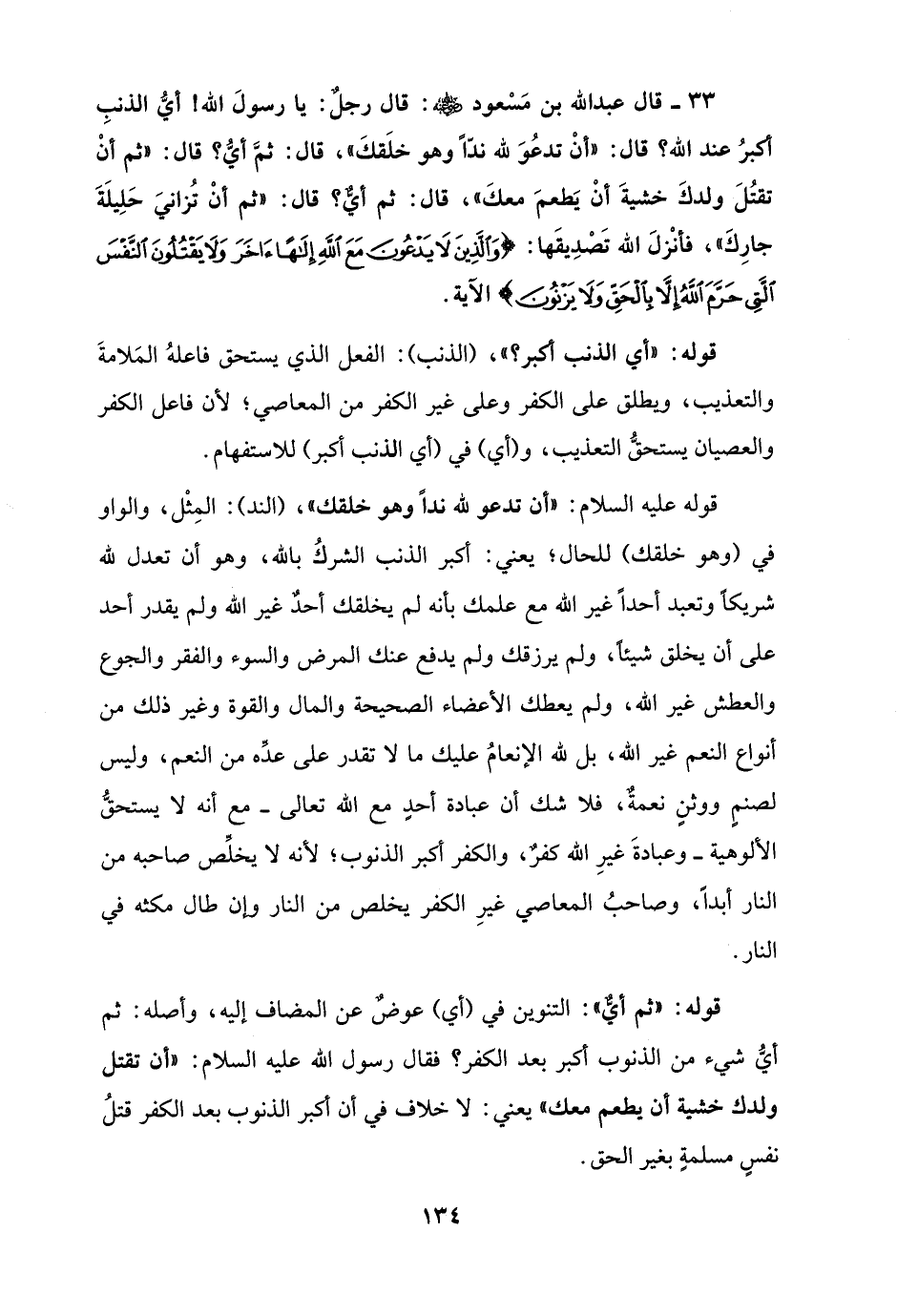 33 - قال عبد الله بن مَسْعود - رضي الله عنه -: قال رجلٌ: يا رسولَ الله! أيُّ الذنبِ أكبرُ عند الله؟ قال: "أنْ تدعُوَ لله ندًّا وهو خلَقكَ"، قال: ثمَّ أيُّ؟ قال: "ثم أنْ تقتُلَ ولدكَ خشيةَ أنْ يَطعمَ معكَ"، قال: ثم أيٌّ؟ قال: "ثم أنْ تُزانيَ حَلِيلَةَ جارِكَ"، فأنْزلَ الله تَصْدِيقَها: {وَالَّذِينَ لَا يَدْعُونَ مَعَ اللَّهِ إِلَهًا آخَرَ وَلَا يَقْتُلُونَ النَّفْسَ الَّتِي حَرَّمَ اللَّهُ إِلَّا بِالْحَقِّ وَلَا يَزْنُونَ} الآية.