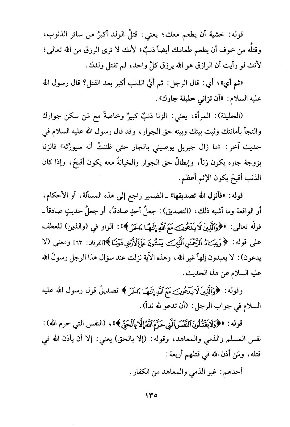قوله: "فأنزل الله تصديقها" - الضمير راجع إلى هذه المسألة، أو الأحكام، أو الواقعة وما أشبه ذلك، (التصديق): جعلُ أحدٍ صادقًا، أو جعلُ حديثٍ صادقًا - قولَه تعالى: " {وَالَّذِينَ لَا يَدْعُونَ مَعَ اللَّهِ إِلَهًا آخَرَ} ": الواو في (والذين) للعطف على قوله: {وَعِبَادُ الرَّحْمَنِ الَّذِينَ يَمْشُونَ عَلَى الْأَرْضِ هَوْنًا} [الفرقان: 63] ومعنى (لا يدعون): لا يعبدون إلهًا غير الله، وهذه الآية نزلت عند سؤال هذا الرجل رسولَ الله عليه السلام عن هذا الحديث.