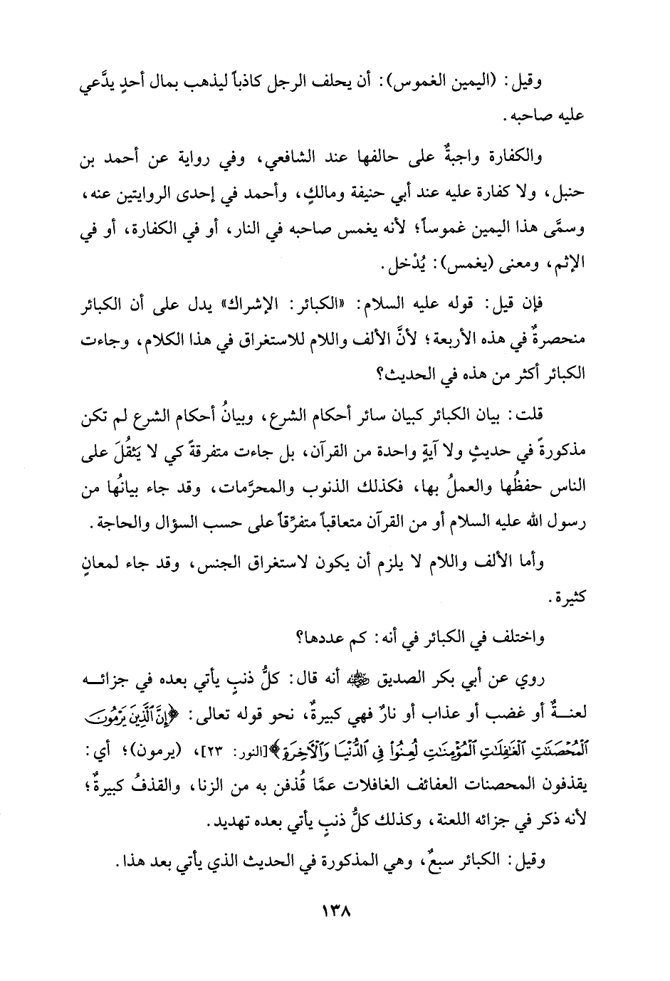 روي عن أبي بكر الصديق - رضي الله عنه - أنه قال: كلُّ ذنبٍ يأتي بعده في جزائه لعنةٌ أو غضب أو عذاب أو نارٌ فهي كبيرةٌ، نحو قوله تعالى: {إِنَّ الَّذِينَ يَرْمُونَ الْمُحْصَنَاتِ الْغَافِلَاتِ الْمُؤْمِنَاتِ لُعِنُوا فِي الدُّنْيَا وَالْآخِرَةِ} [النور: 23]، (يرمون)؛ أي: يقذفون المحصنات العفائف الغافلات عمَّا قُذفن به من الزنا، والقذفُ كبيرةٌ؛ لأنه ذكر في جزائه اللعنة، وكذلك كلُّ ذنبٍ يأتي بعده تهديد.