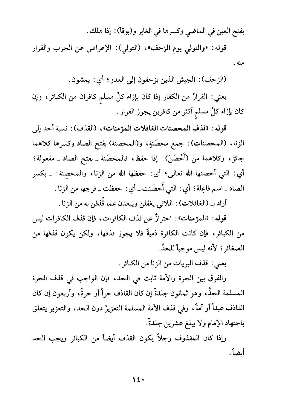 قوله: "قذف المحصنات الغافلات المؤمنات"، (القذف): نسبة أحد إلى الزنا، (المحصنات): جمع محصَنةٍ، و (المحصنة) بفتح الصاد وكسرها كلاهما جائز، وكلاهما من (أَحْصَنَ): إذا حفظ، فالمحصَنة - بفتح الصاد - مفعولة؛ أي: التي أحصنها الله تعالى؛ أي: حفظها الله من الزنا، والمحصِنة: - بكسر الصاد - اسم فاعِلة؛ أي: التي أَحصَنت - أي: حفظت - فرجها من الزنا.