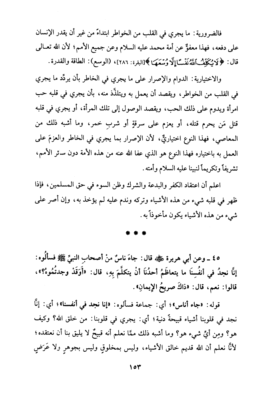 45 - وعن أبي هريرة - رضي الله عنه - قال: جاءَ ناسٌ منْ أصحابِ النبيِّ - صلى الله عليه وسلم - فسألُوه: إنَّا نجدُ في أنفُسِنَا ما يتعاظَمُ أحدُنَا أنْ يتكلَّمَ بِهِ، قال: "أَوَقَدْ وجدتُمُوهُ؟ "، قالوا: نعم، قال: "ذاكَ صريحُ الإِيمانِ".