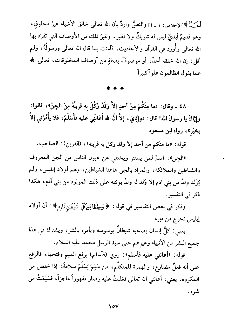 48 - وقال: "ما مِنْكُمْ مِنْ أحدٍ إلاَّ وَقَدْ وُكِّلَ بِهِ قرينُهُ مِنَ الجِنَّ"، قالوا: وإيَّاكَ يا رسولَ الله! قال: "وإيَّايَ، إلاَّ أنَّ الله أَعَانَنِي عليه فأَسْلَم، فلا يأْمُرُني إلاَّ بخيْرٍ"، رواه ابن مسعود.