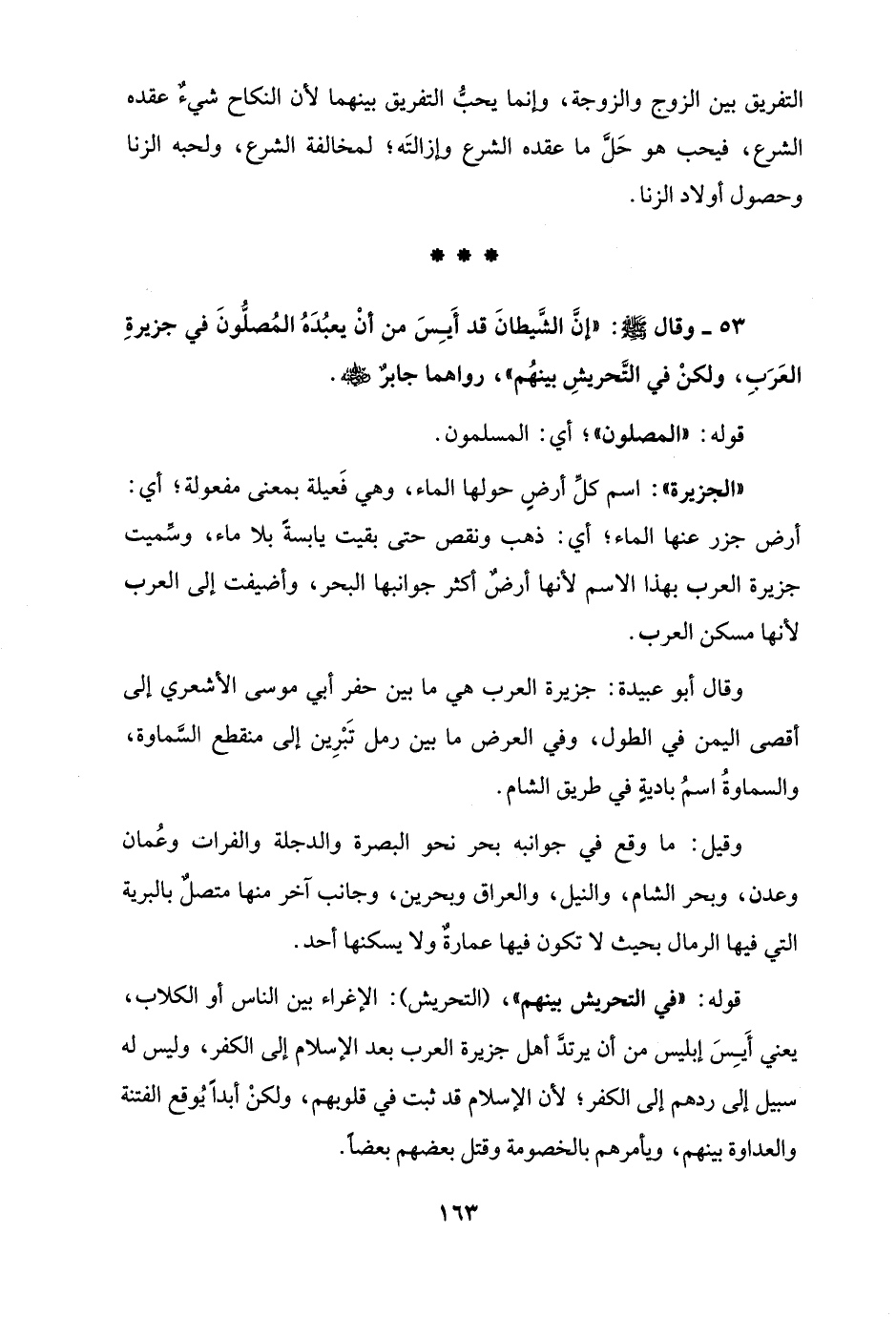 53 - وقال - صلى الله عليه وسلم -: "إنَّ الشَّيطانَ قد أَيِسَ من أنْ يعبُدَهُ المُصلُّونَ في جزيرةِ العَرَبِ، ولكنْ في التَّحريشِ بينهُم"، رواهما جابرٌ - رضي الله عنه -.