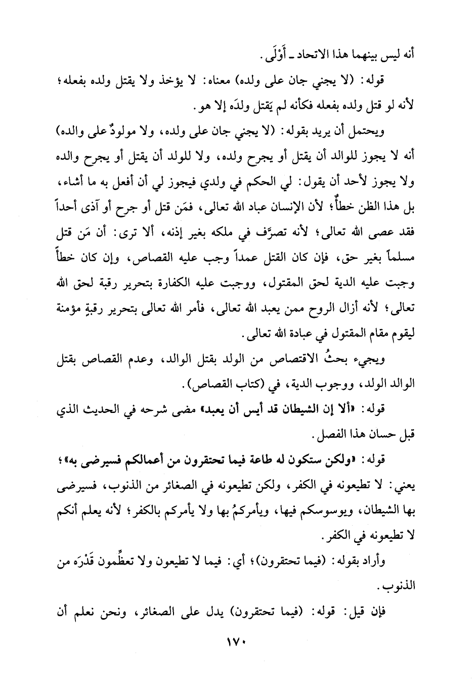 ويحتمل أن يريد بقوله: (لا يجني جان على ولده، ولا مولودٌ على والده) أنه لا يجوز للوالد أن يقتل أو يجرح ولده، ولا للولد أن يقتل أو يجرح والده ولا يجوز لأحد أن يقول: لي الحكم في ولدي فيجوز لي أن أفعل به ما أشاء، بل هذا الظن خطأٌ؛ لأن الإنسان عباد الله تعالى، فمَن قتل أو جرح أو آذى أحدًا فقد عصى الله تعالى؛ لأنه تصرَّف في ملكه بغير إذنه، ألا ترى: أن مَن قتل مسلمًا بغير حق، فإن كان القتل عمدًا وجب عليه القصاص، وإن كان خطأً وجبت عليه الدية لحق المقتول، ووجبت عليه الكفارة بتحرير رقبة لحق الله تعالى؛ لأنه أزال الروح ممن يعبد الله تعالى، فأمر الله تعالى بتحرير رقبةٍ مؤمنة ليقوم مقام المقتول في عبادة الله تعالى.