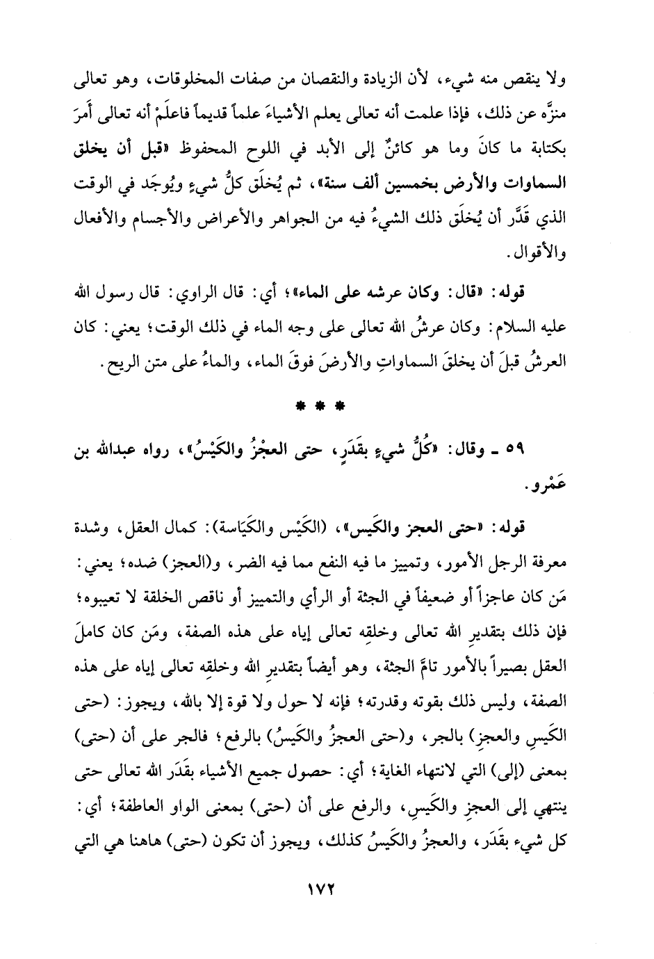 59 - وقال: "كُلُّ شيءٍ بقَدَرٍ، حتى العجْزُ والكَيْسُ"، رواه عبد الله بن عَمْرو.