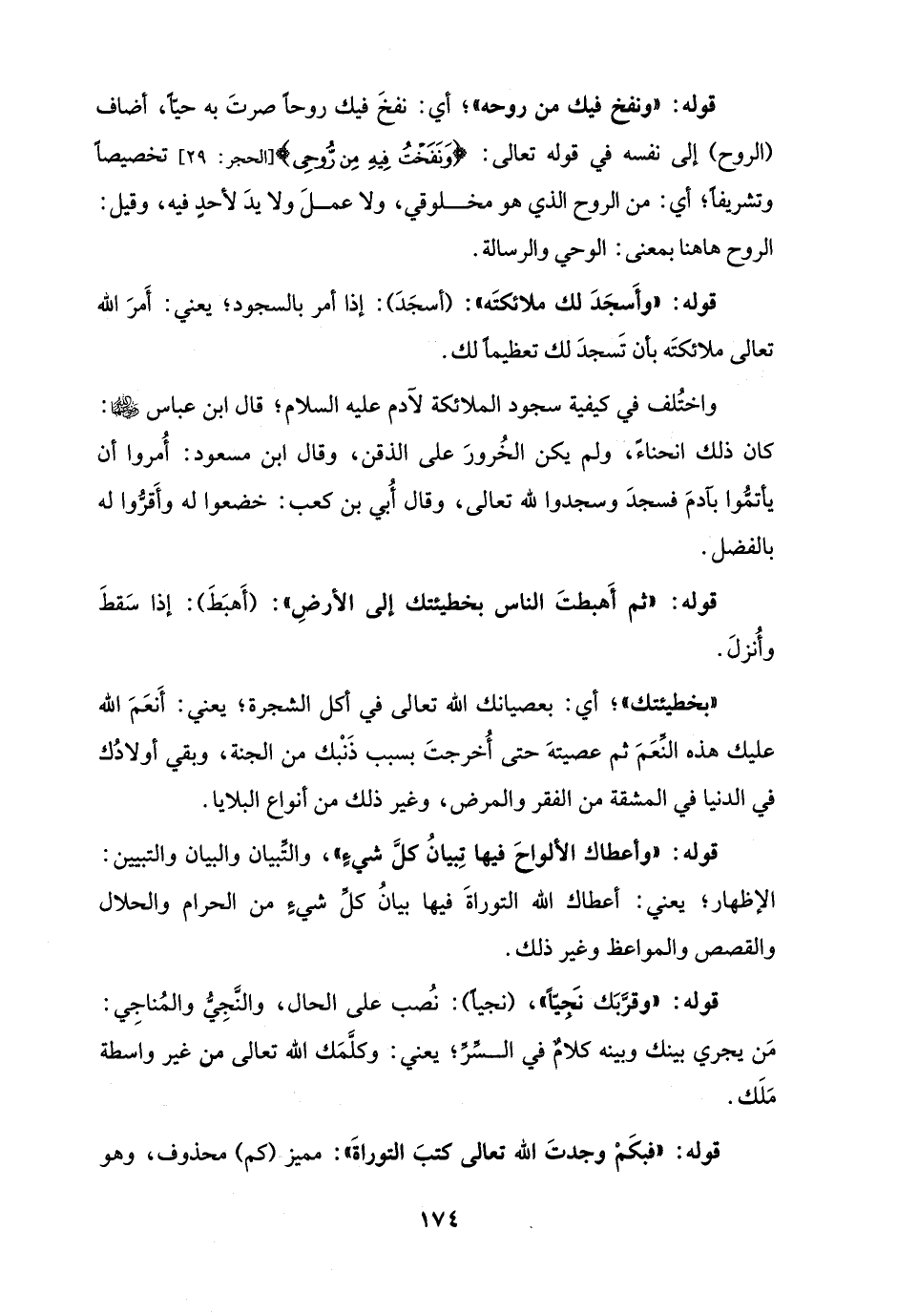 واختُلف في كيفية سجود الملائكة لآدم عليه السلام؛ قال ابن عباس - رضي الله عنهما -: كان ذلك انحناءً، ولم يكن الخُرورَ على الذقن، وقال ابن مسعود: أُمروا أن يأتمُّوا بآدمَ فسجدَ وسجدوا لله تعالى، وقال أُبي بن كعب: خضعوا له وأَقرُّوا له بالفضل.