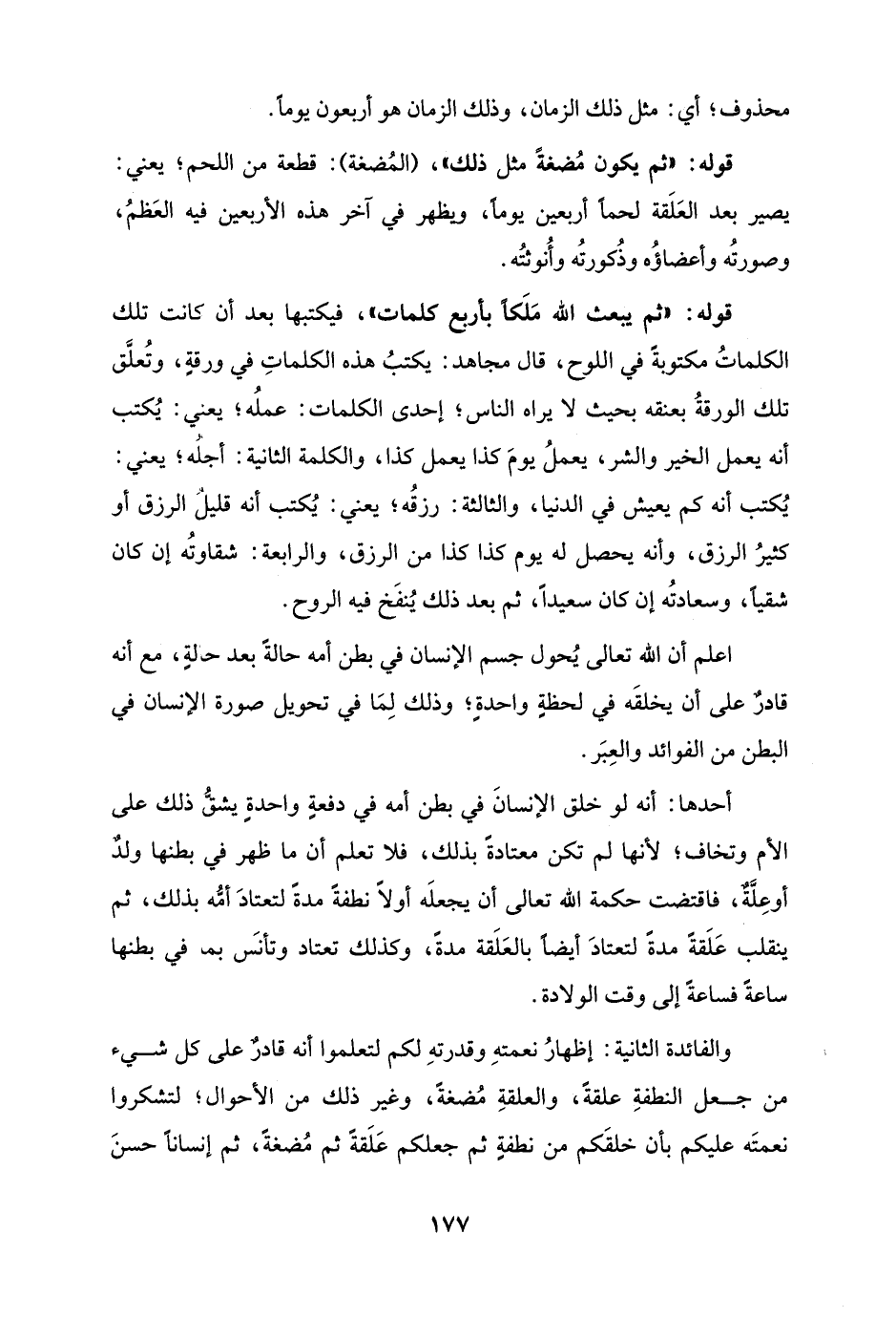 والفائدة الثانية: إظهارُ نعمتهِ وقدرتهِ لكم لتعلموا أنه قادرٌ على كل شيء من جعل النطفةِ علقةً، والعلقةِ مُضغةً، وغير ذلك من الأحوال؛ لتشكروا نعمتَه عليكم بأن خلقَكم من نطفةٍ ثم جعلكم عَلَقةً ثم مُضغةً، ثم إنسانًا حسنَ