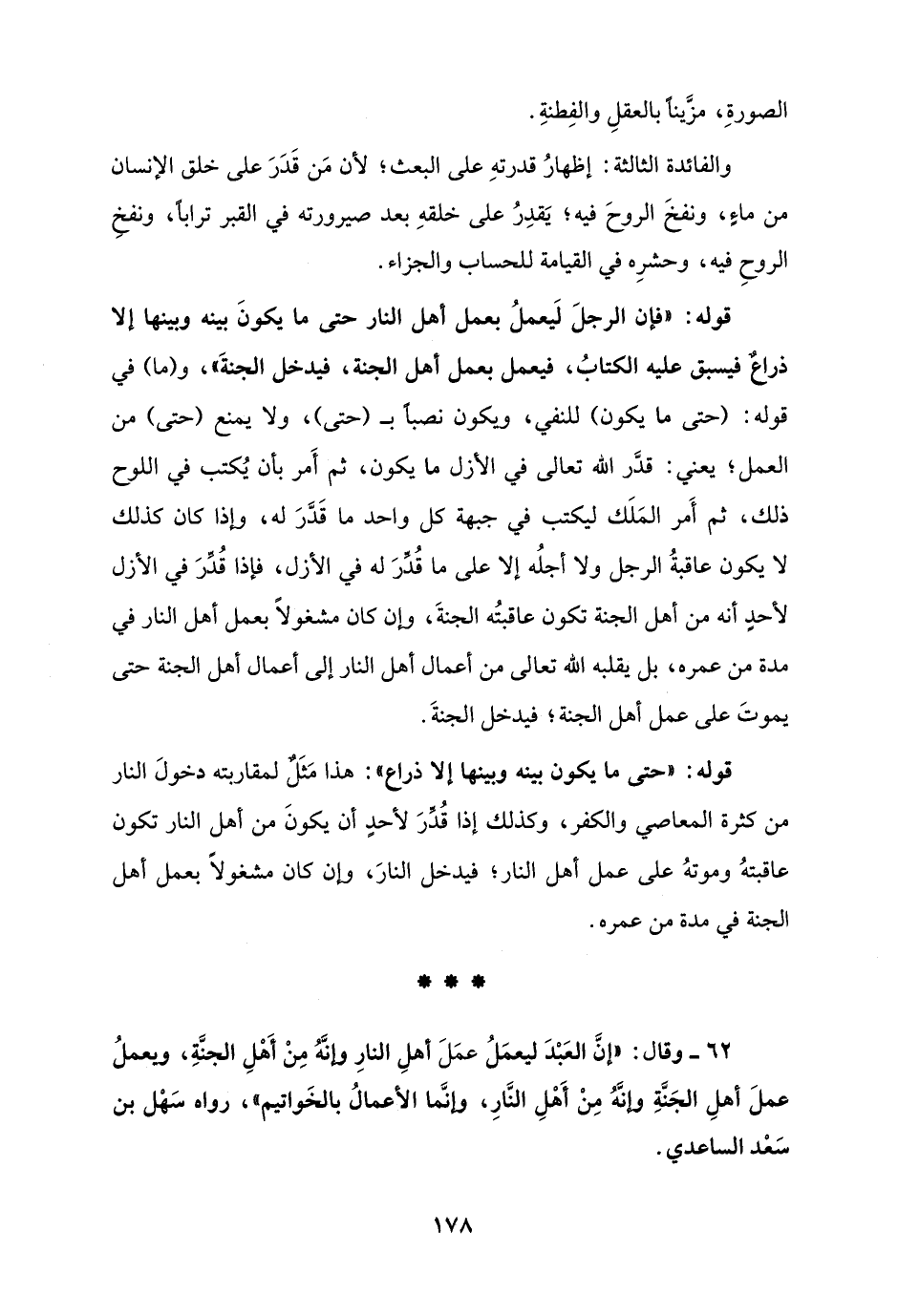 قوله: "فإن الرجلَ لَيعملُ بعمل أهل النار حتى ما يكونَ بينه وبينها إلا ذراعٌ فيسبق عليه الكتابُ، فيعمل بعمل أهل الجنة، فيدخل الجنةَ"، و (ما) في قوله: (حتى ما يكون) للنفي، ويكون نصبًا بـ (حتى)، ولا يمنع (حتى) من العمل؛ يعني: قدَّر الله تعالى في الأزل ما يكون، ثم أَمر بأن يُكتب في اللوح ذلك، ثم أَمر المَلَك ليكتب في جبهة كل واحد ما قَدَّرَ له، وإذا كان كذلك لا يكون عاقبةُ الرجل ولا أجلُه إلا على ما قُدِّرَ له في الأزل، فإذا قُدَّرَ في الأزل لأحدٍ أنه من أهل الجنة تكون عاقبتُه الجنةَ، وإن كان مشغولًا بعمل أهل النار في مدة من عمره، بل يقلبه الله تعالى من أعمال أهل النار إلى أعمال أهل الجنة حتى يموتَ على عمل أهل الجنة؛ فيدخل الجنةَ.