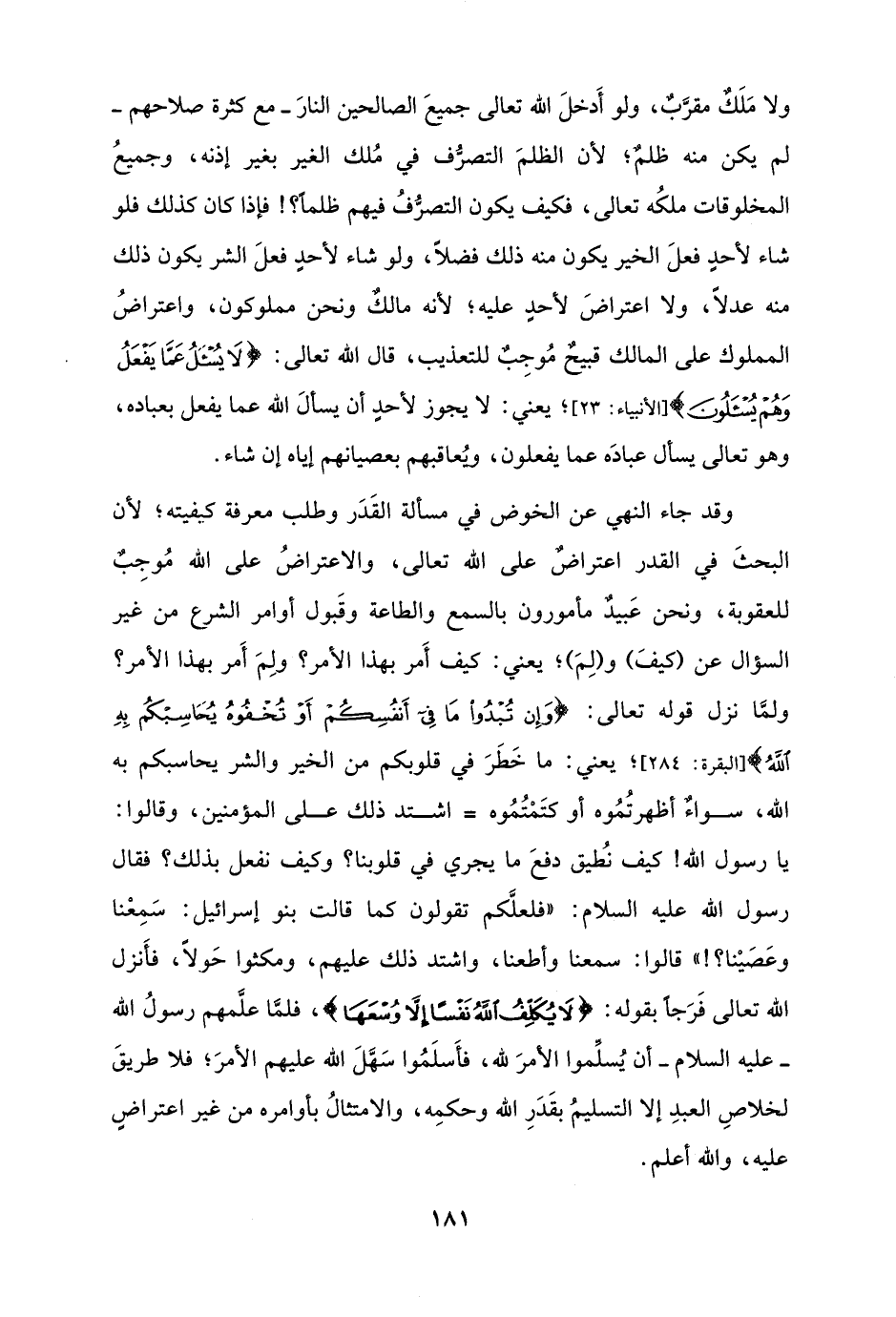 وقد جاء النهي عن الخوض في مسألة القَدَر وطلب معرفة كيفيته؛ لأن البحثَ في القدر اعتراضٌ على الله تعالى، والاعتراضُ على الله مُوجِبٌ للعقوبة، ونحن عَبيدٌ مأمورون بالسمع والطاعة وقَبول أوامر الشرع من غير السؤال عن (كيفَ) و (لِمَ)؛ يعني: كيف أَمر بهذا الأمر؟ ولِمَ أَمر بهذا الأمر؟ ولمَّا نزل قوله تعالى: {وَإِنْ تُبْدُوا مَا فِي أَنْفُسِكُمْ أَوْ تُخْفُوهُ يُحَاسِبْكُمْ بِهِ اللَّهُ} [البقرة: 284]؛ يعني: ما خَطَرَ في قلوبكم من الخير والشر يحاسبكم به الله، سواءٌ أظهرتُمُوه أو كتَمْتُمُوه = اشتد ذلك على المؤمنين، وقالوا: يا رسول الله! كيف نُطيق دفعَ ما يجري في قلوبنا؟ وكيف نفعل بذلك؟ فقال رسول الله عليه السلام: "فلعلَّكم تقولون كما قالت بنو إسرائيل: سَمِعْنا وعَصَيْنا؟! " قالوا: سمعنا وأطعنا، واشتد ذلك عليهم، ومكثوا حَولًا، فأنزل الله تعالى فَرَجًا بقوله: {لَا يُكَلِّفُ اللَّهُ نَفْسًا إِلَّا وُسْعَهَا}، فلمَّا علَّمهم رسولُ الله - عليه السلام - أن يُسلِّموا الأمرَ لله، فأسلَمُوا سَهَّلَ الله عليهم الأمرَ؛ فلا طريقَ لخلاصِ العبدِ إلا التسليمُ بقَدَرِ الله وحكمِه، والامتثالُ بأوامره من غير اعتراضٍ عليه، والله أعلم.