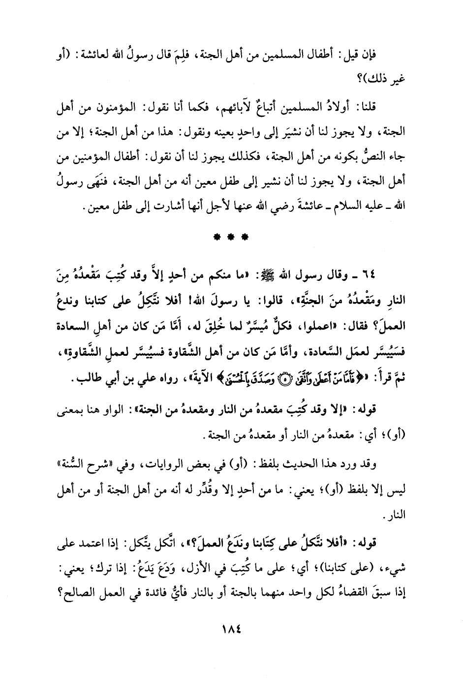64 - وقال رسول الله - صلى الله عليه وسلم -: "ما منكم من أحدٍ إلاَّ وقد كُتِبَ مَقْعدُهُ مِنَ النارِ ومَقْعدُهُ منَ الجنَّةِ"، قالوا: يا رسولَ الله! أفلا نتَّكِلُ على كتابنا وندعُ العملَ؟ فقال: "اعملوا، فكلٌّ مُيسَّرٌ لما خُلِقَ له، أَمَّا مَن كان من أهلِ السعادة فسَيُيسَّر لعمَل السَّعادة، وأمَّا مَن كان من أهل الشَّقاوة فسيُيسَّر لعملِ الشَّقاوةِ"، ثمَّ قرأَ: " {فَأَمَّا مَنْ أَعْطَى وَاتَّقَى (5) وَصَدَّقَ بِالْحُسْنَى} الآيةَ"، رواه علي بن أبي طالب.